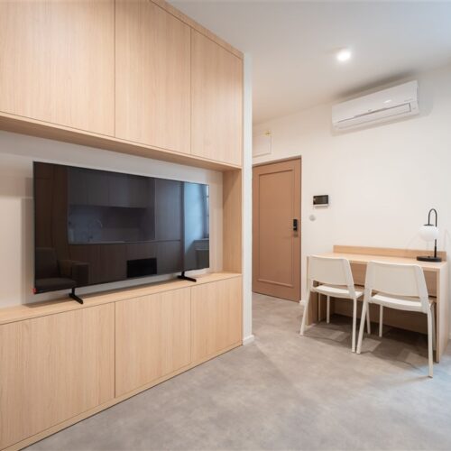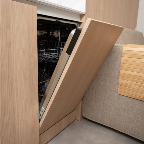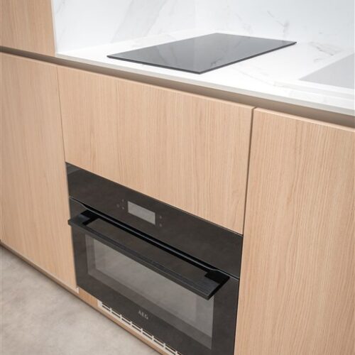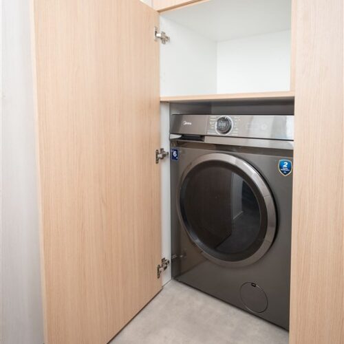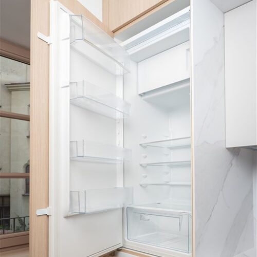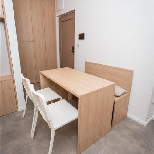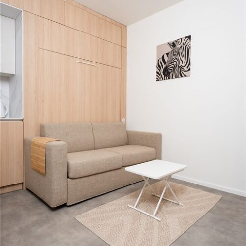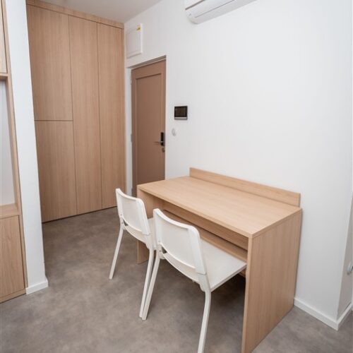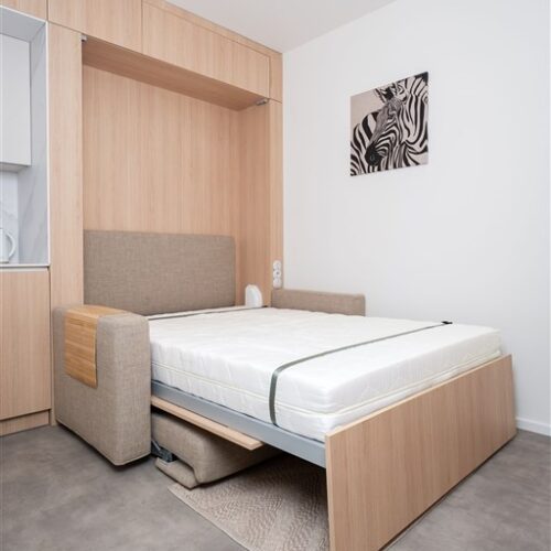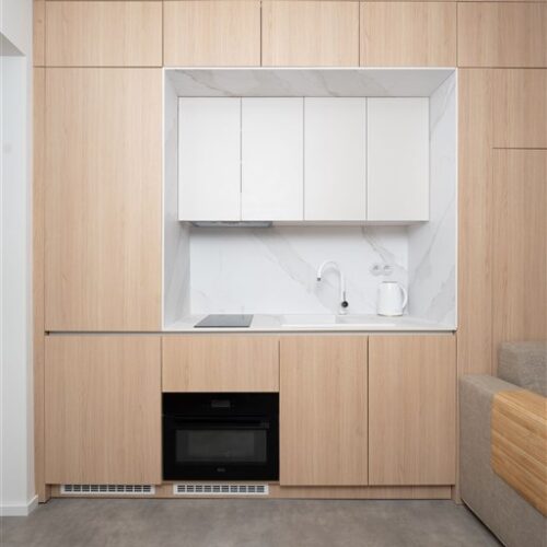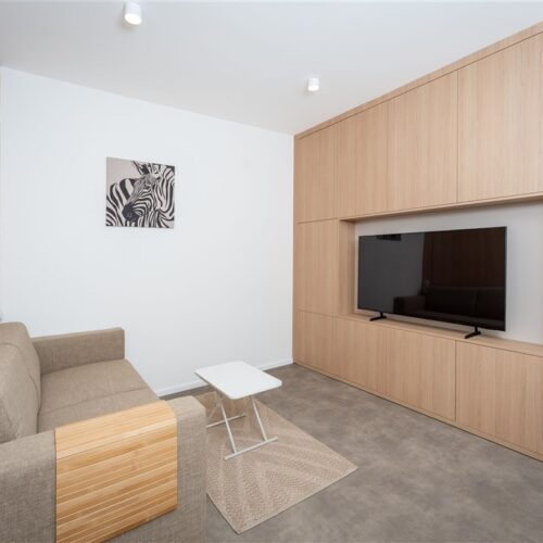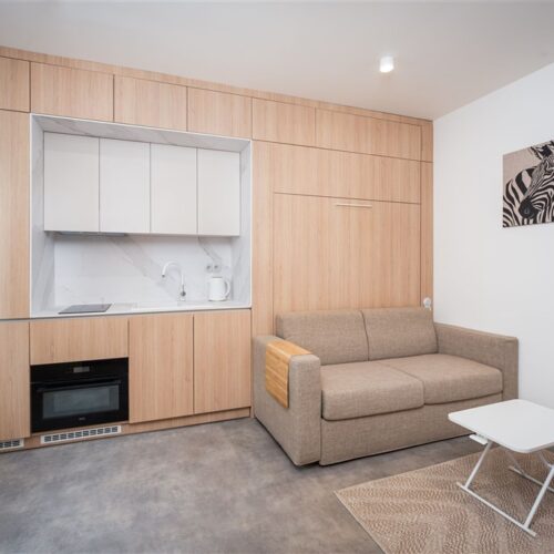Apartmán je plně vybaven tak, aby ubytovaným poskytl maximální komfort během jejich pobytu. Kuchyňský kout je kompletně zařízen moderními spotřebiči, včetně varné desky, digestoře, kombinované elektrické a mikrovlnné trouby, rychlovarné konvice a lednice s mrazákem. Dominantou obývací části je designový rozkládací gauč, který lze snadno přeměnit v pohodlné dvoulůžko. K dispozici je také moderní televize s možností sledování všech oblíbených programů a vestavěné skříně z kvalitních materiálů, které zajišťují dostatek úložného prostoru. Elegantní koupelna je vybavena sprchovým koutem, toaletou a praktickým úložným prostorem. Součástí apartmánu je také pračka, nenápadně integrovaná do interiéru, klimatizace zajišťující příjemné klima v každém ročním období a vysokorychlostní internetové připojení.