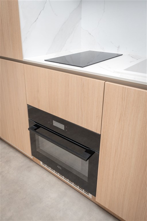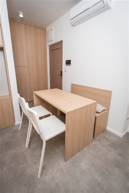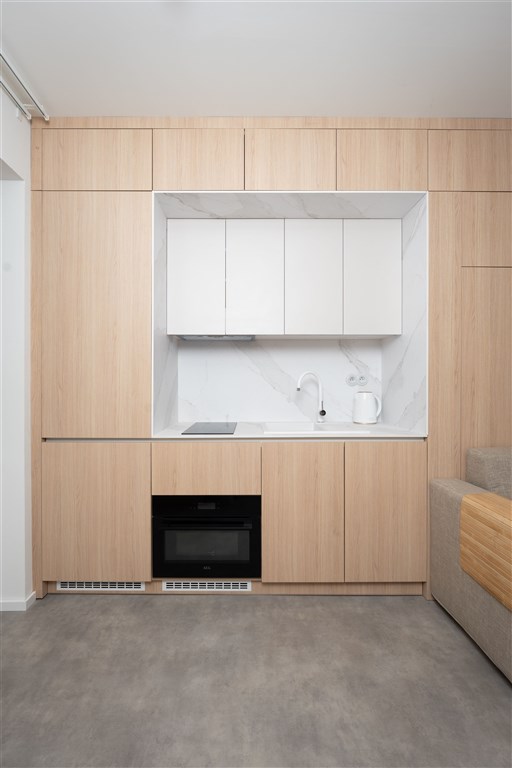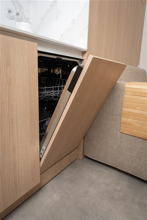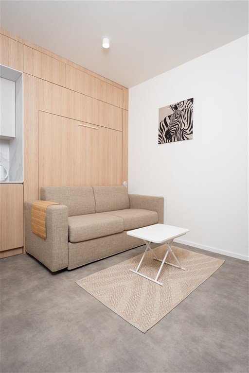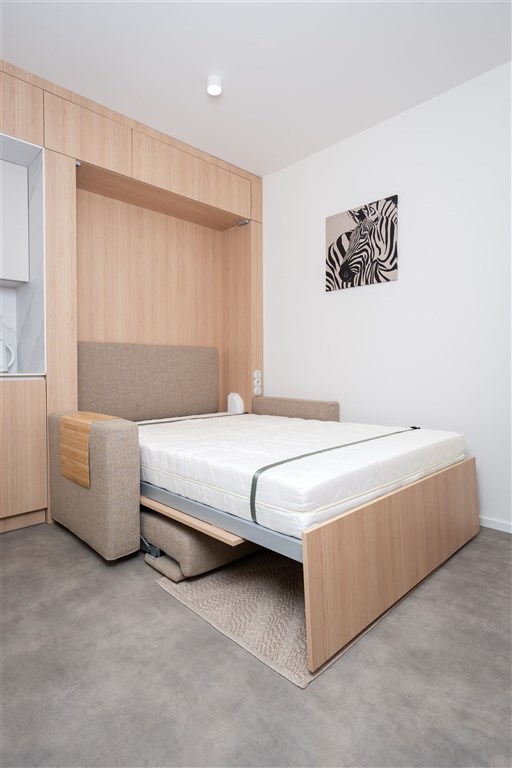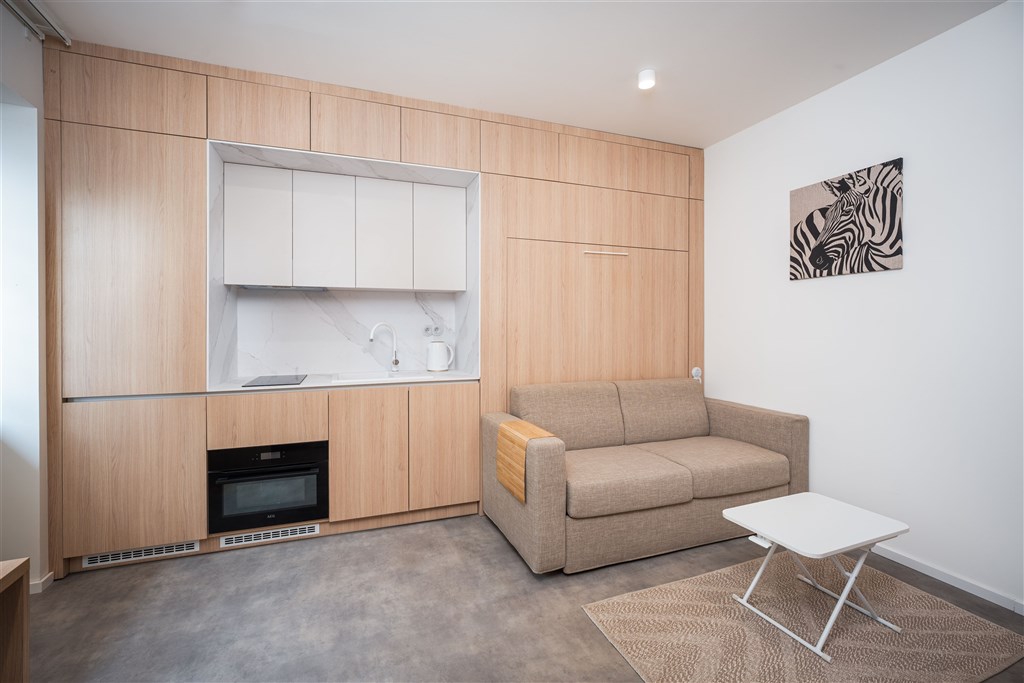Apartmán je plně vybaven tak, aby ubytovaným poskytl maximální komfort během jejich pobytu. Kuchyňský kout je kompletně zařízen moderními spotřebiči, včetně varné desky, digestoře, kombinované elektrické a mikrovlnné trouby, rychlovarné konvice a lednice s mrazákem. Dominantou obývací části je designový rozkládací gauč, který lze snadno přeměnit v pohodlné dvoulůžko. K dispozici je také moderní televize s možností sledování všech oblíbených programů a vestavěné skříně z kvalitních materiálů, které zajišťují dostatek úložného prostoru. Elegantní koupelna je vybavena sprchovým koutem, toaletou a praktickým úložným prostorem. Součástí apartmánu je také pračka, nenápadně integrovaná do interiéru, klimatizace zajišťující příjemné klima v každém ročním období a vysokorychlostní internetové připojení.