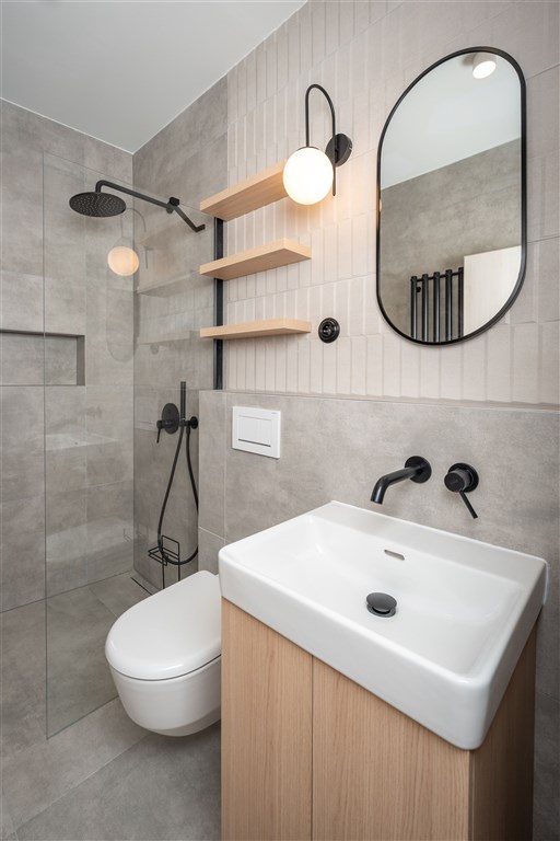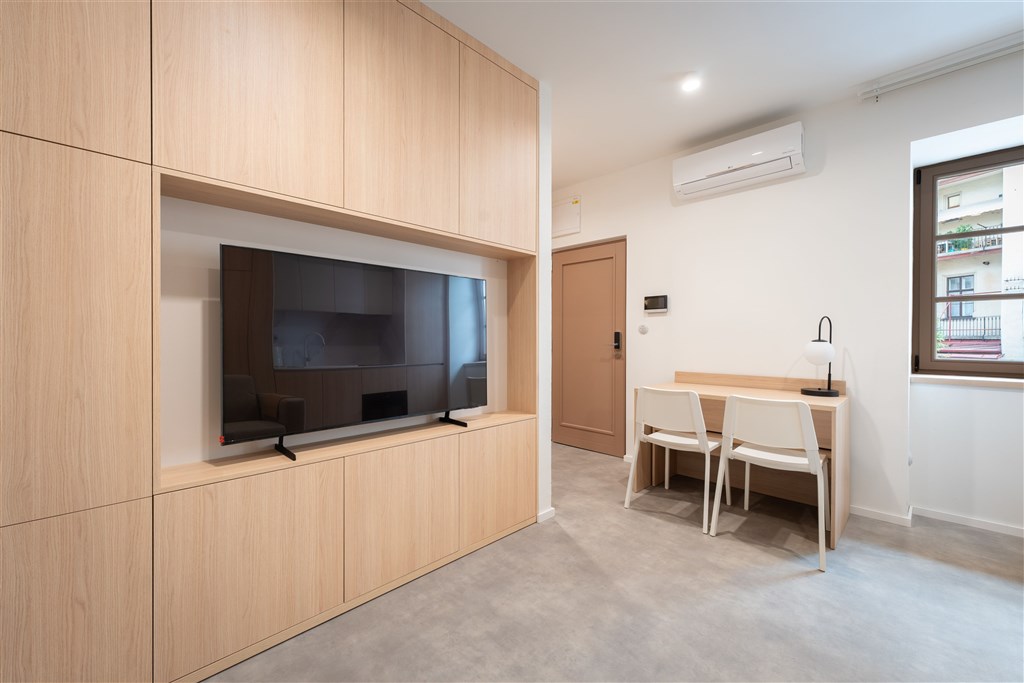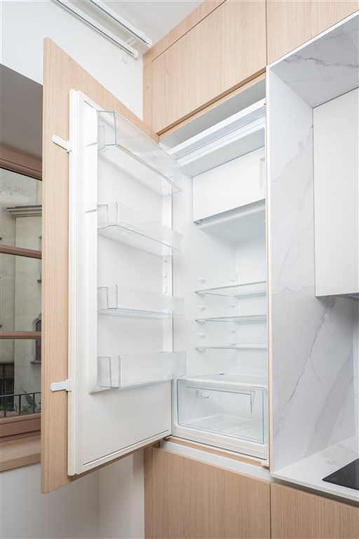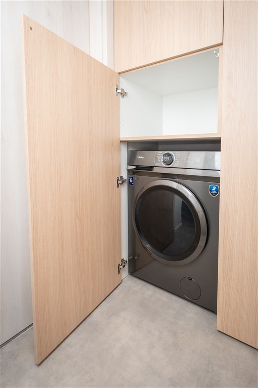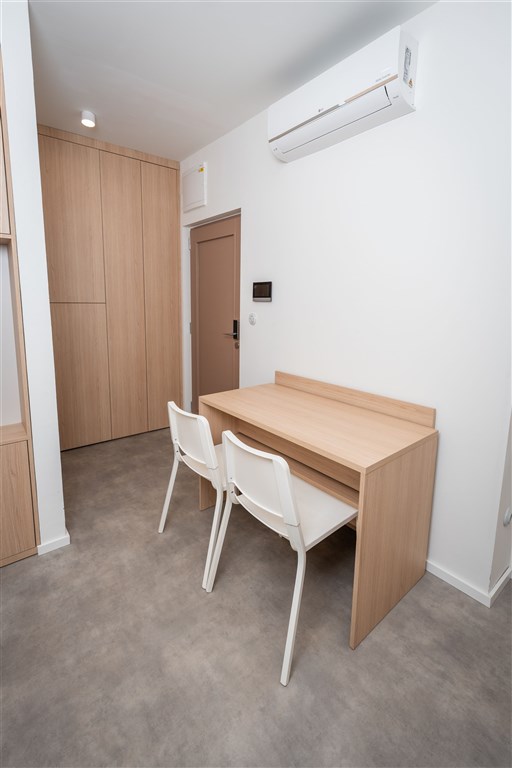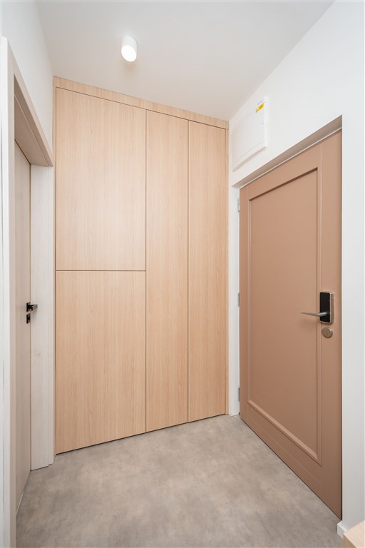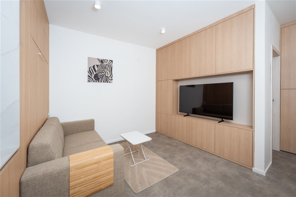 Apartmán je plně vybaven tak, aby ubytovaným poskytl maximální komfort během jejich pobytu. Kuchyňský kout je kompletně zařízen moderními spotřebiči, včetně varné desky, digestoře, kombinované elektrické a mikrovlnné trouby, rychlovarné konvice a lednice s mrazákem. Dominantou obývací části je designový rozkládací gauč, který lze snadno přeměnit v pohodlné dvoulůžko. K dispozici je také moderní televize s možností sledování všech oblíbených programů a vestavěné skříně z kvalitních materiálů, které zajišťují dostatek úložného prostoru. Elegantní koupelna je vybavena sprchovým koutem, toaletou a praktickým úložným prostorem. Součástí apartmánu je také pračka, nenápadně integrovaná do interiéru, klimatizace zajišťující příjemné klima v každém ročním období a vysokorychlostní internetové připojení.