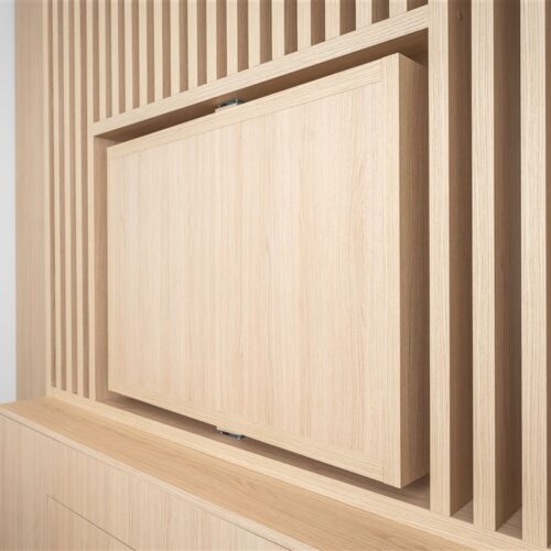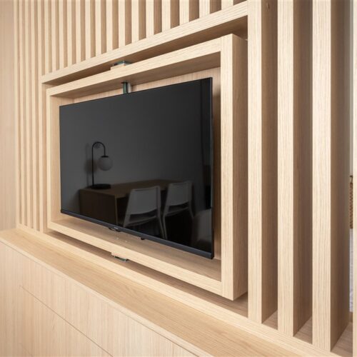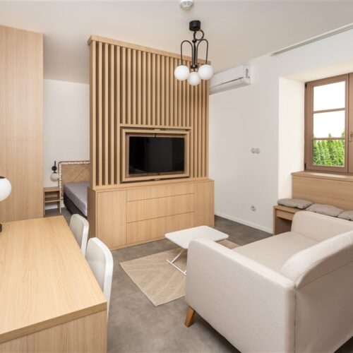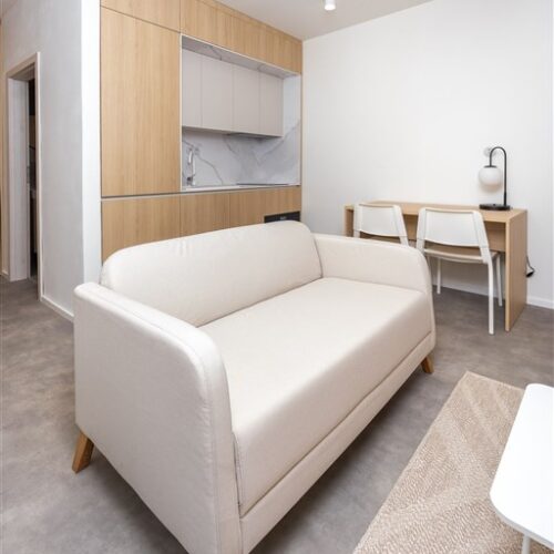 Apartmán je plně vybaven a připraven k okamžitému ubytování. Kuchyňský kout disponuje kvalitními spotřebiči – varnou deskou, digestoří, elektrickou troubou s funkcí mikrovlnné trouby, varnou konvicí a lednicí s mrazákem. Dominantou obývací části je designový gauč, ze kterého můžete pohodlně sledovat své oblíbené pořady na moderním televizoru umístěném na otočné stěně – tu lze snadno otočit i směrem ke spací části s manželskou postelí.