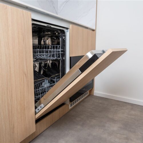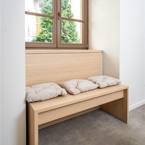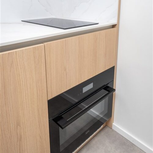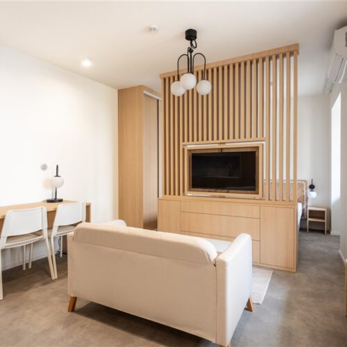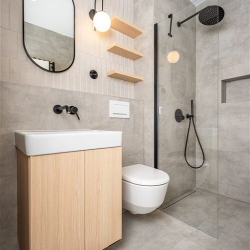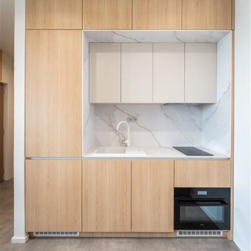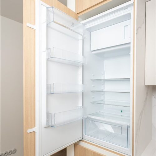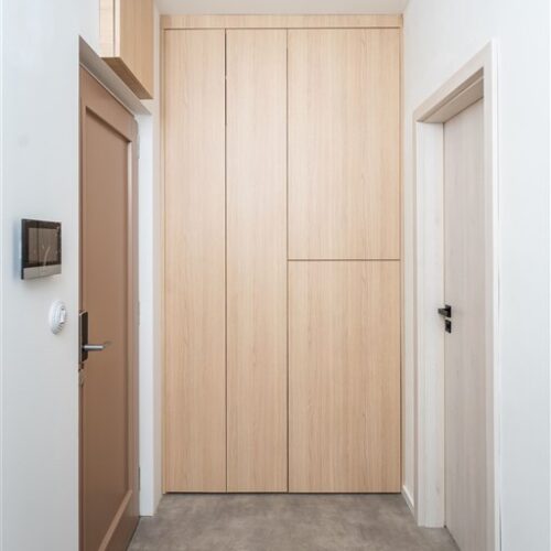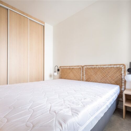 Vestavěné skříně z prvotřídních materiálů poskytují dostatek úložného prostoru. Koupelna nabízí elegantní sprchový kout, toaletu a umyvadlo se zrcadlem a úložným prostorem. Součástí vybavení je také pračka se sušičkou, která je chytře skrytá, aby nenarušovala čistý vzhled interiéru. Samozřejmostí je vysokorychlostní internetové připojení a klimatizace pro Váš maximální komfort.