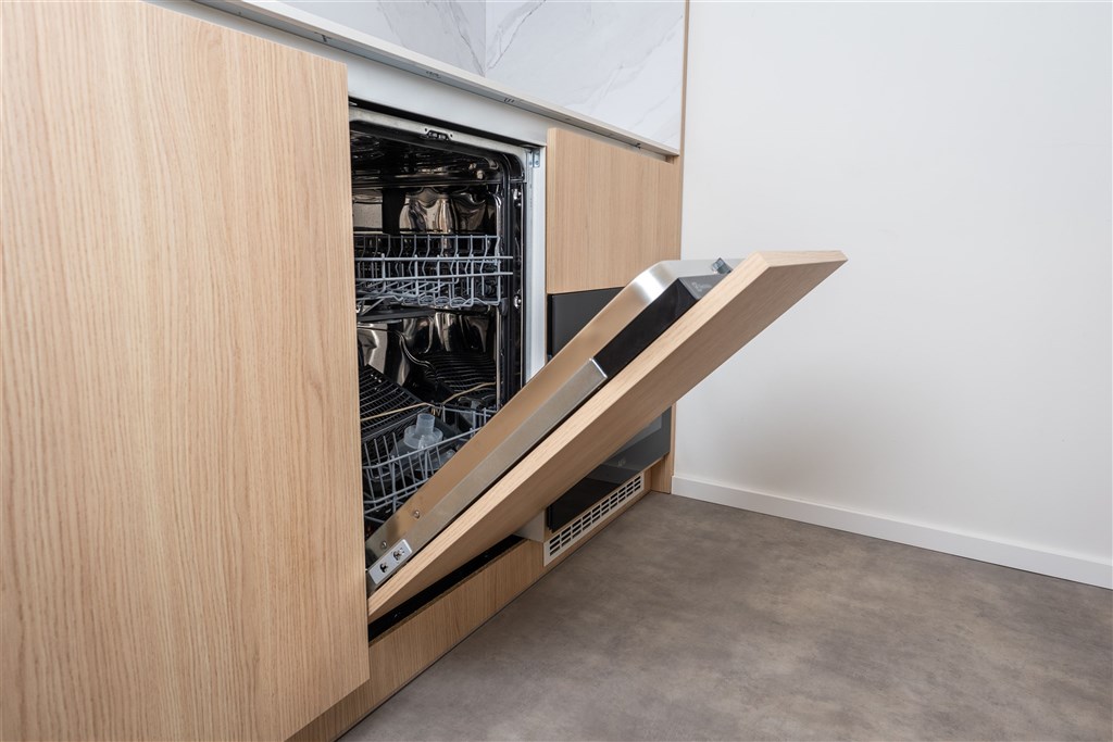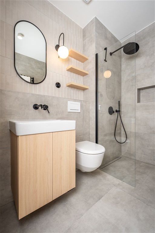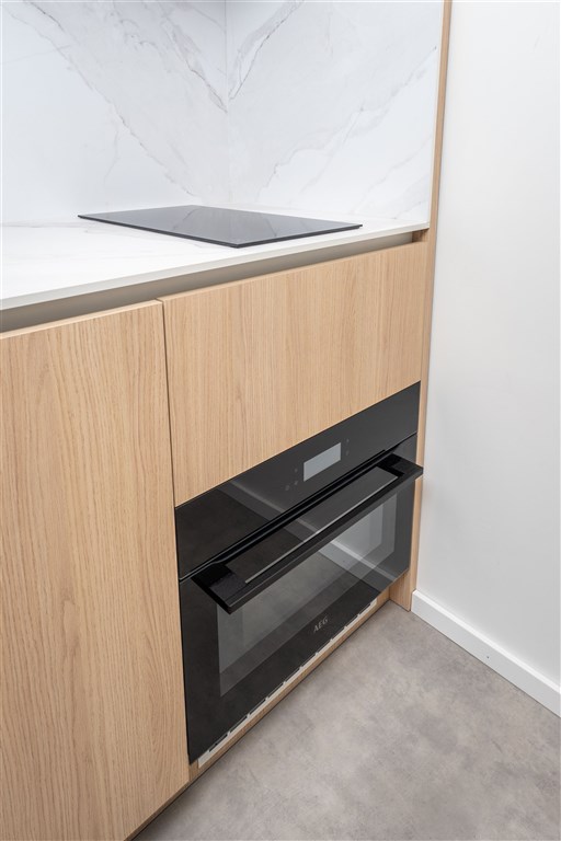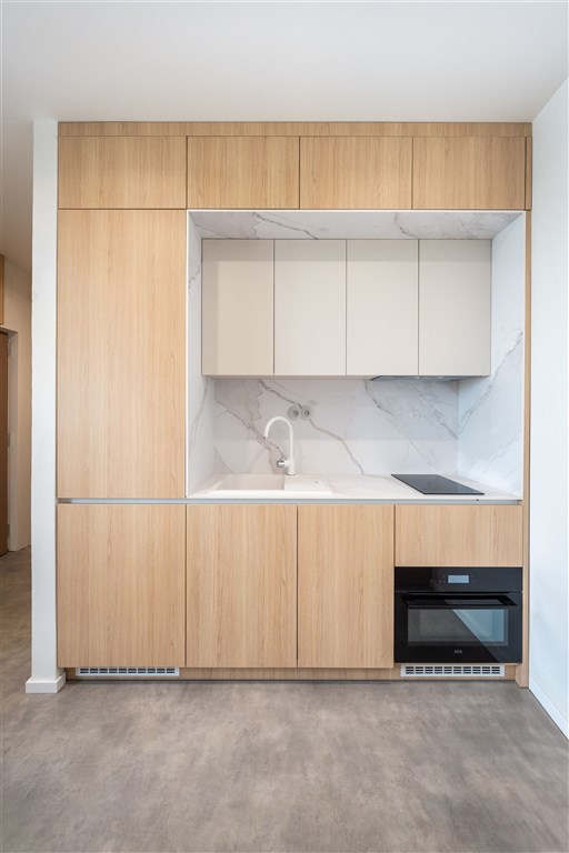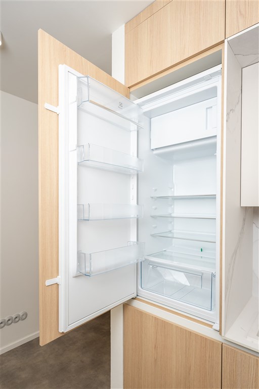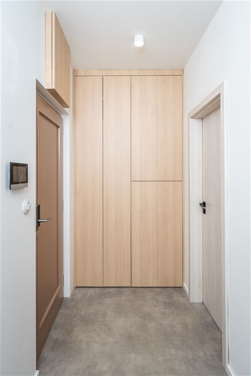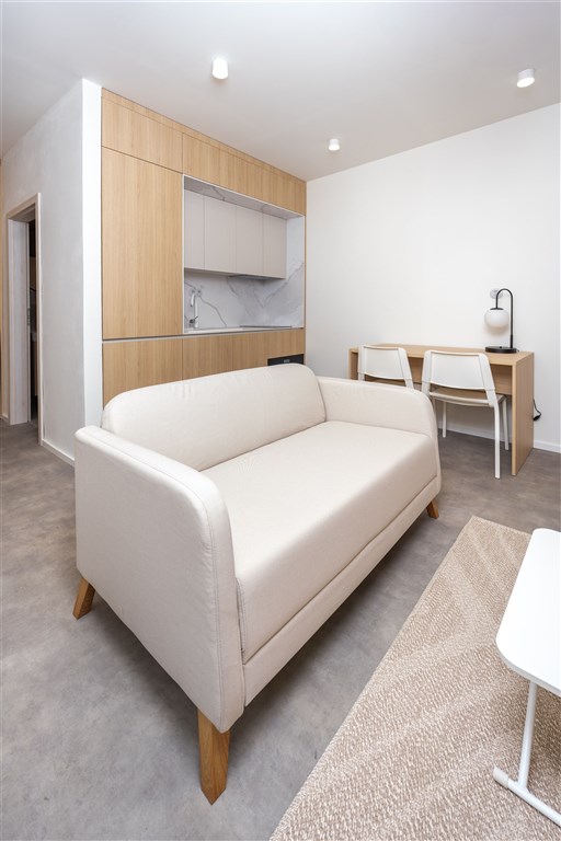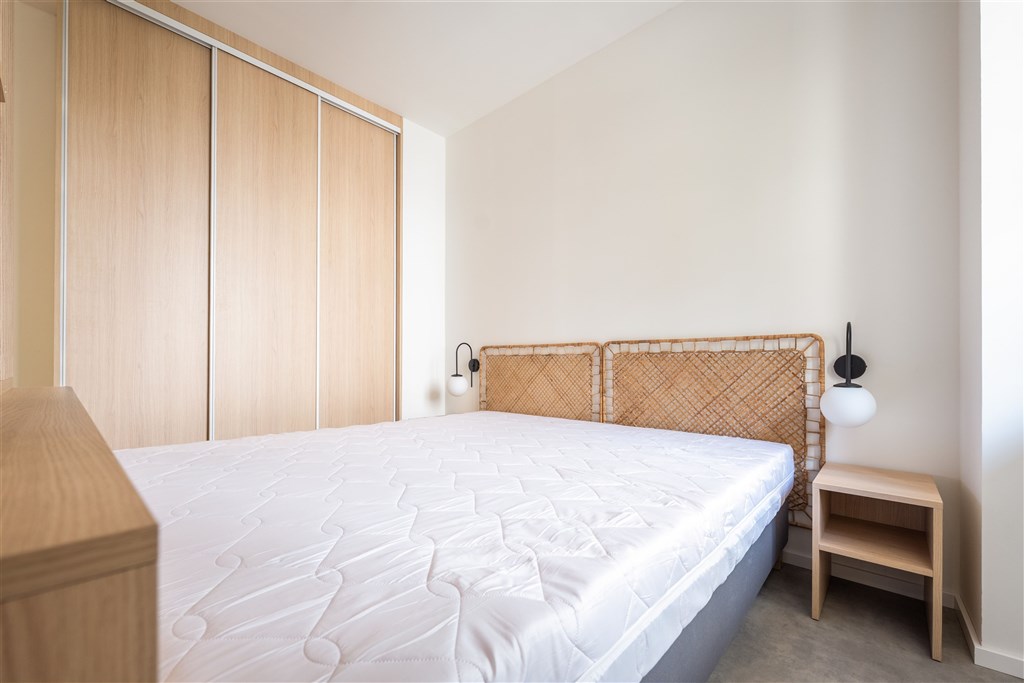 Vestavěné skříně z prvotřídních materiálů poskytují dostatek úložného prostoru. Koupelna nabízí elegantní sprchový kout, toaletu a umyvadlo se zrcadlem a úložným prostorem. Součástí vybavení je také pračka se sušičkou, která je chytře skrytá, aby nenarušovala čistý vzhled interiéru. Samozřejmostí je vysokorychlostní internetové připojení a klimatizace pro Váš maximální komfort.