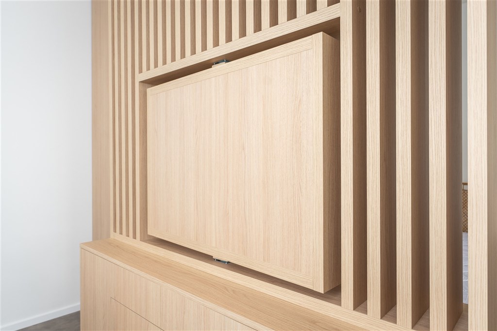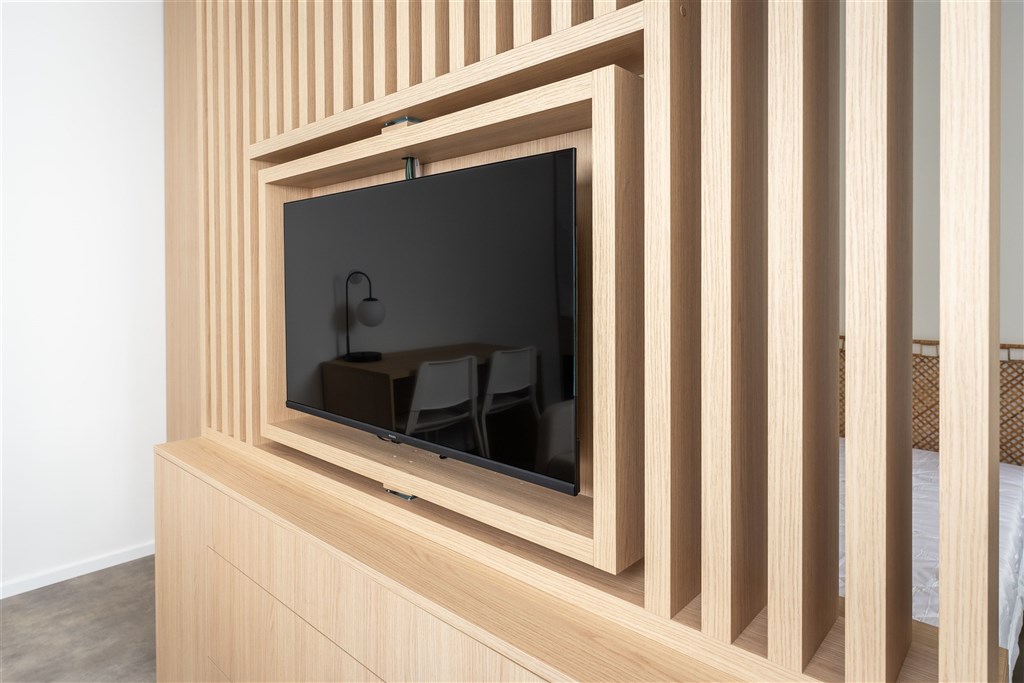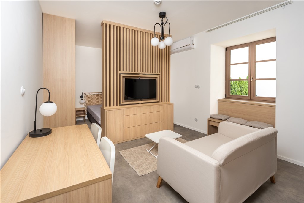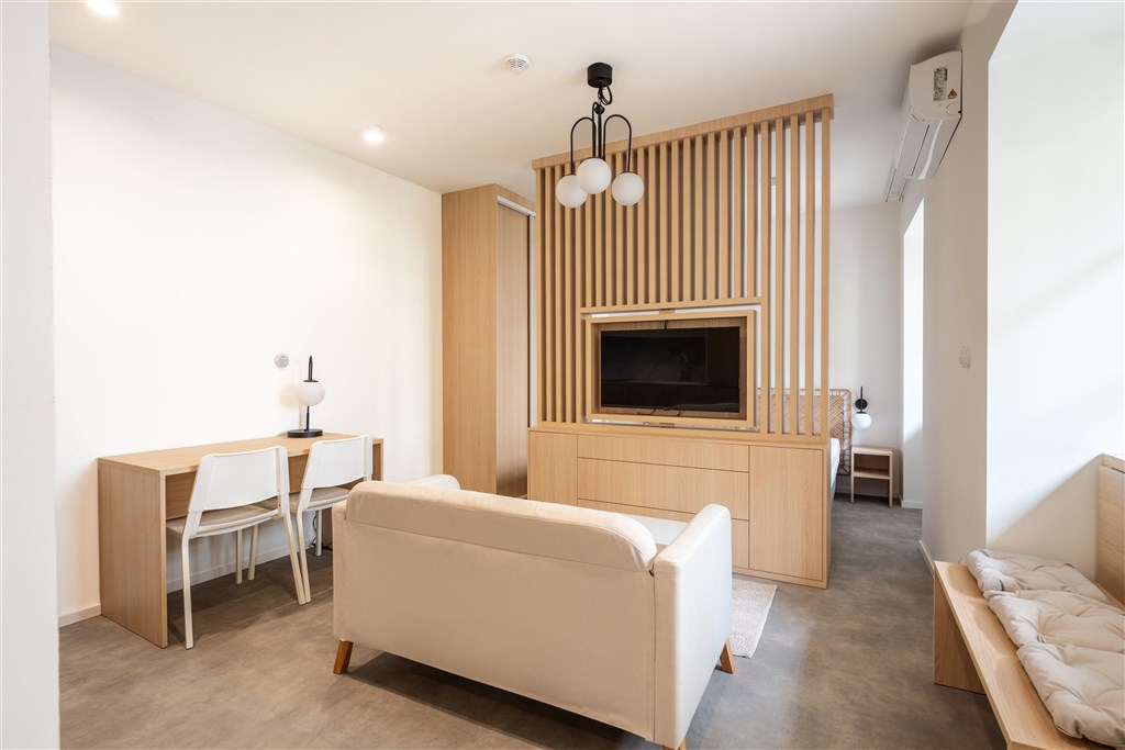 Apartmán je plně vybaven a připraven k okamžitému ubytování. Kuchyňský kout disponuje kvalitními spotřebiči – varnou deskou, digestoří, elektrickou troubou s funkcí mikrovlnné trouby, varnou konvicí a lednicí s mrazákem. Dominantou obývací části je designový gauč, ze kterého můžete pohodlně sledovat své oblíbené pořady na moderním televizoru umístěném na otočné stěně – tu lze snadno otočit i směrem ke spací části s manželskou postelí.