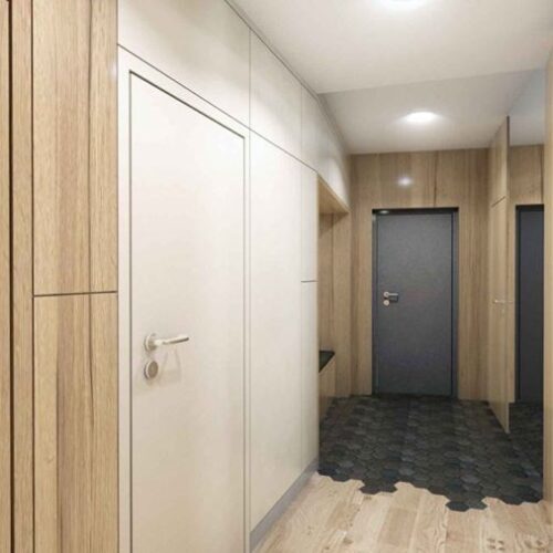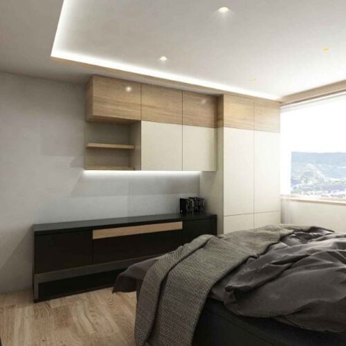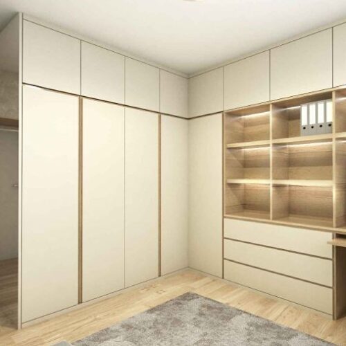 druhý pokoj aktuálně využívaný jako šatna s pracovnou, vybavený vestavěnými skříněmi a