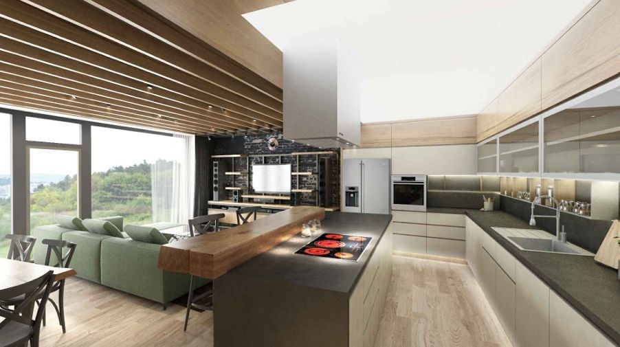 Kuchyňská linka je kompletně zařízená a zahrnuje moderní kuchyňský ostrůvek, varnou desku s pěti