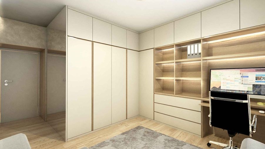 druhý pokoj aktuálně využívaný jako šatna s pracovnou, vybavený vestavěnými skříněmi a