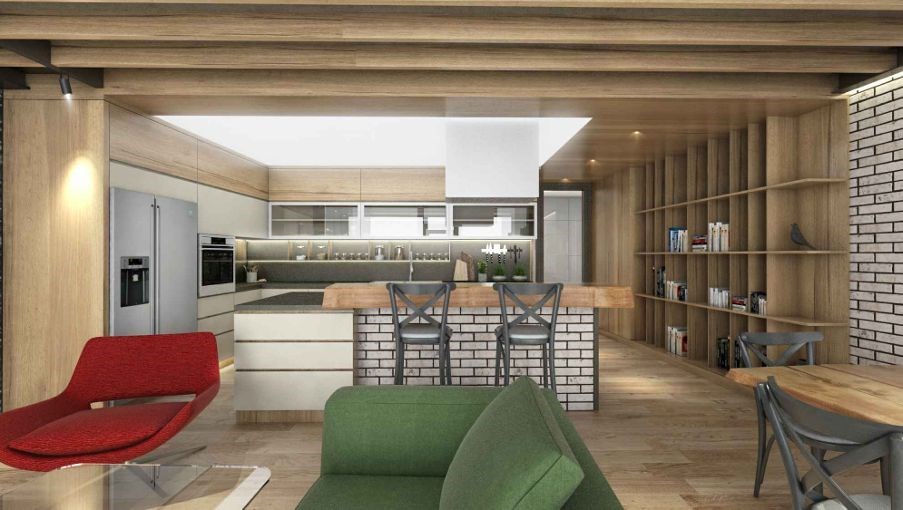 prostorný obývací pokoj propojený s kuchyňským koutem.