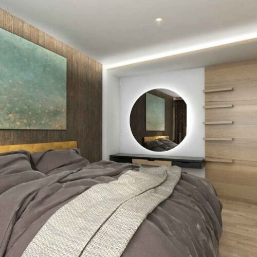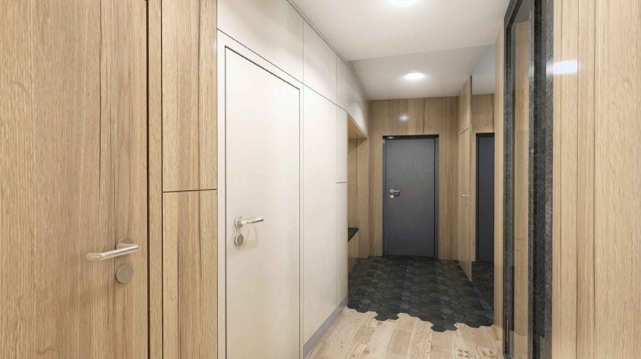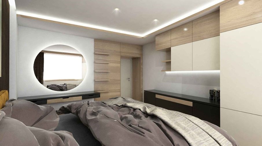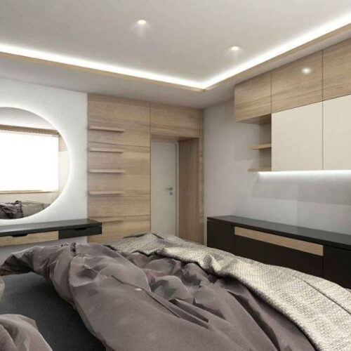 druhý pokoj aktuálně využívaný jako šatna s pracovnou, vybavený vestavěnými skříněmi a