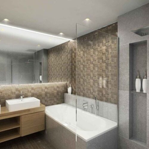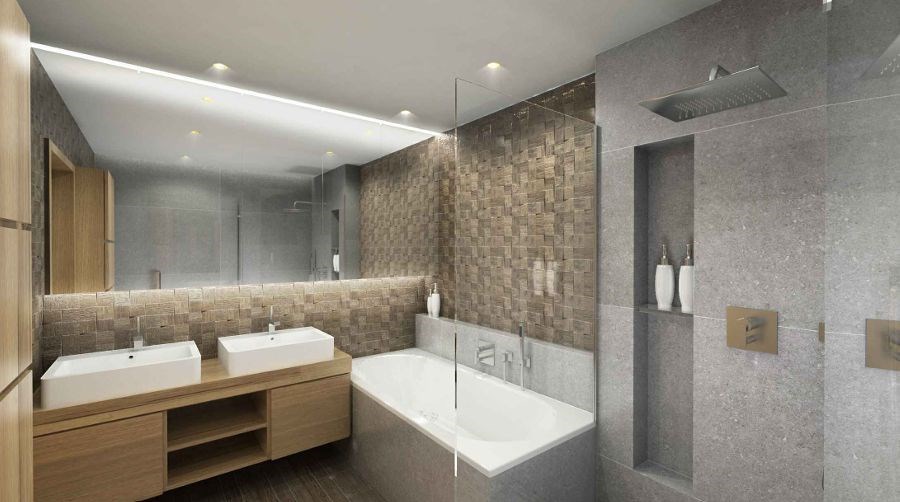 koupelnu se sprchovým koutem, vanou a dvěma umyvadly,