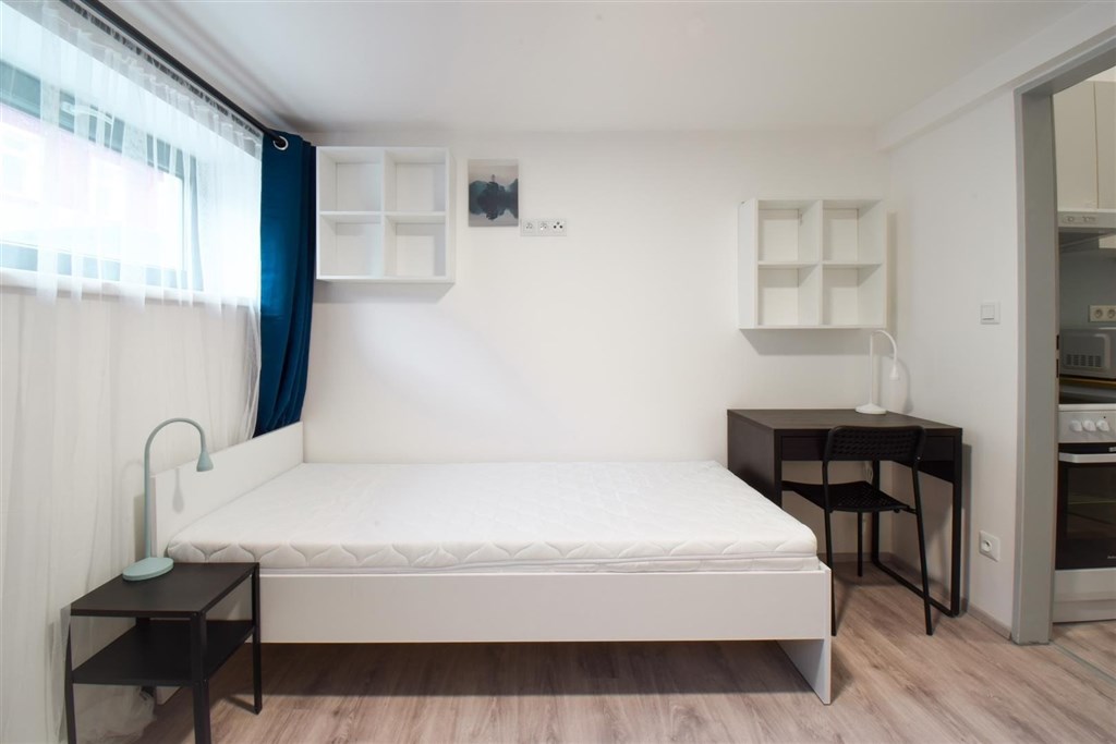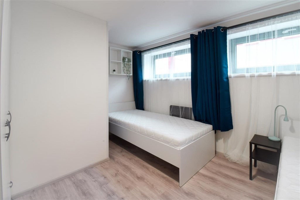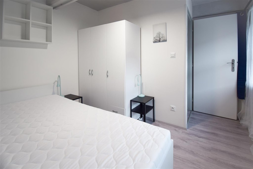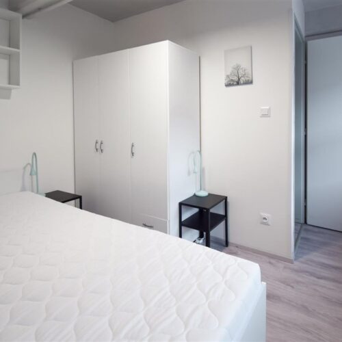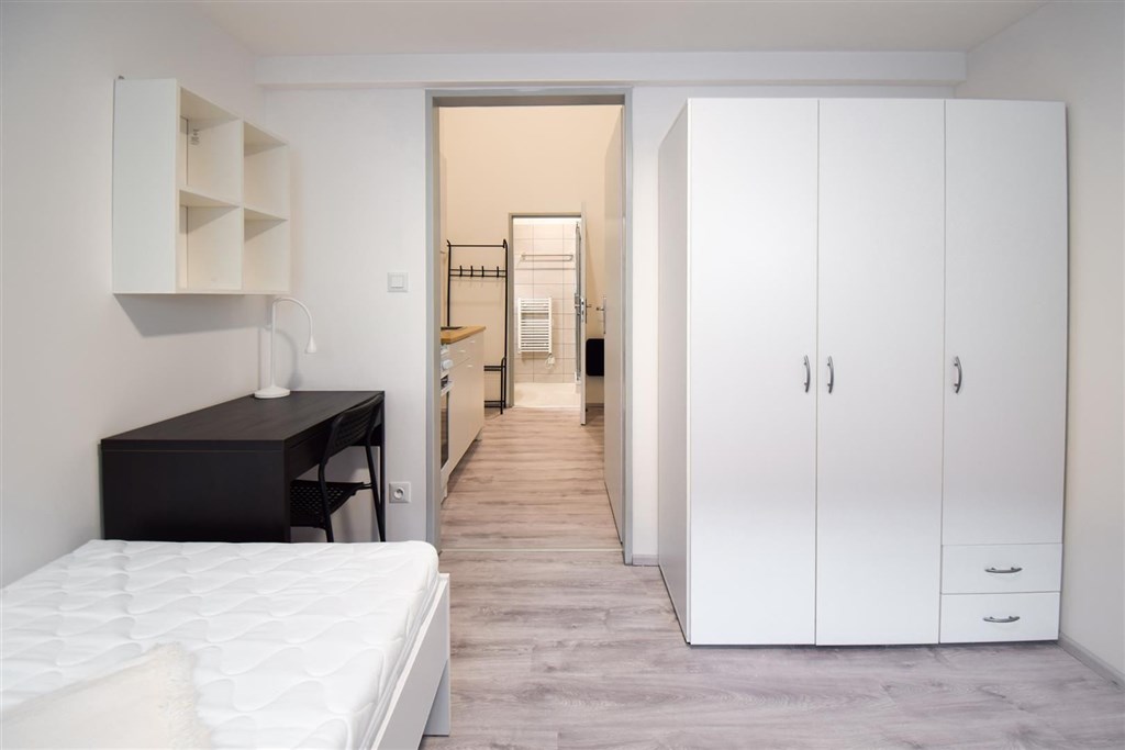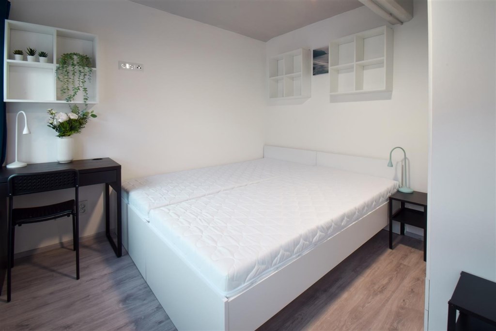Jedná se o podnájem kompletně vybavené bytové jednotky o velikosti 2+1. Při vstupu do bytové jednotky se nachází moderní kuchyně včetně lednice, sporáku s troubou, mikrovlnné trouby, rychlovarné konvice, digestoře a dřezu. Zároveň v kuchyni naleznete jídelní stůl se židlemi. Jednotce imponuje důmyslné řešení dvou neprůchozích pokojů, které jsou umístěny nad sebou a zajistí tak plné využití prostoru. V každém pokoji naleznete dvě prostorné postele s pohodlnou matrací. U postele dále naleznete noční stolek s lampičkou. V jednotce se dále nachází pracovní stoly se židlemi a prostorná skříň. Koupelna nabízí sprchový kout, záchod a umyvadlo se zrcadlem. K dispozici je příprava pro připojení vlastní pračky.