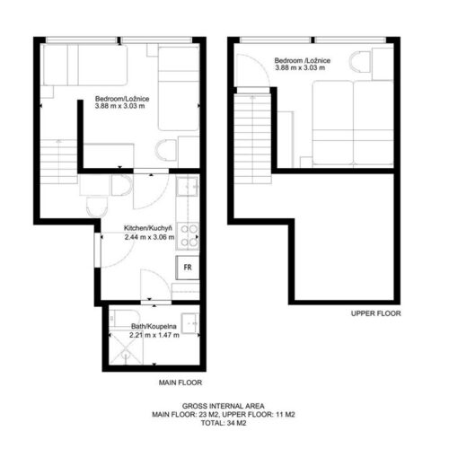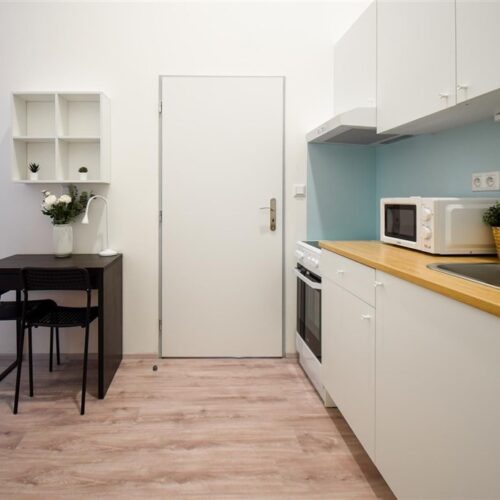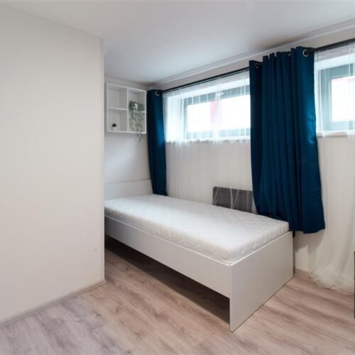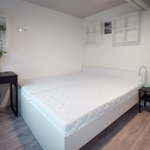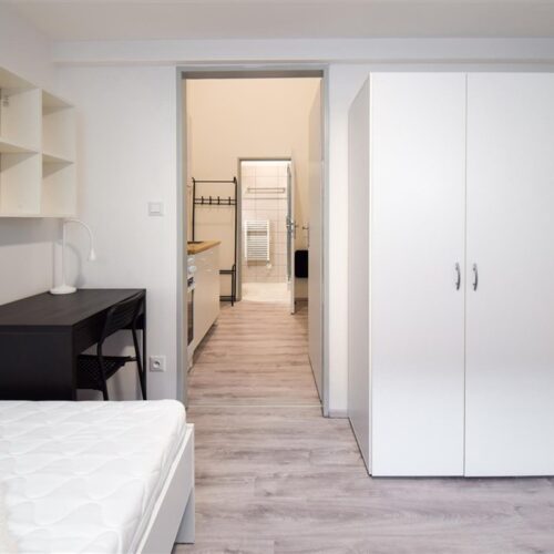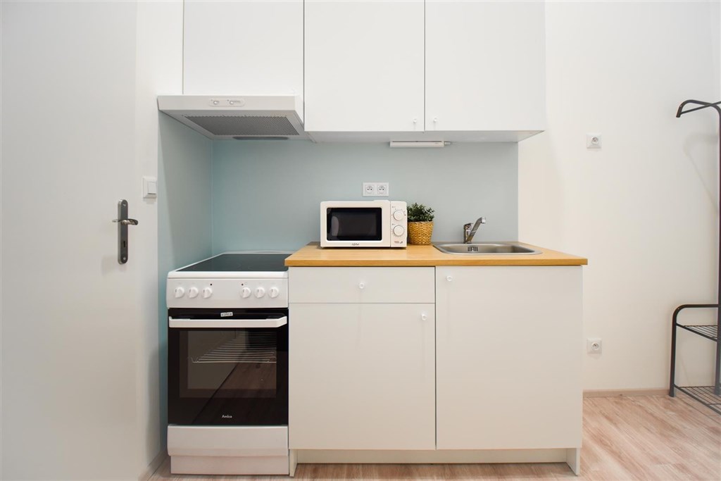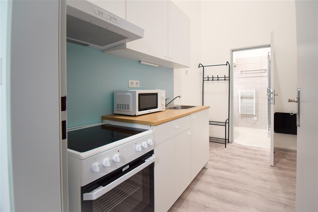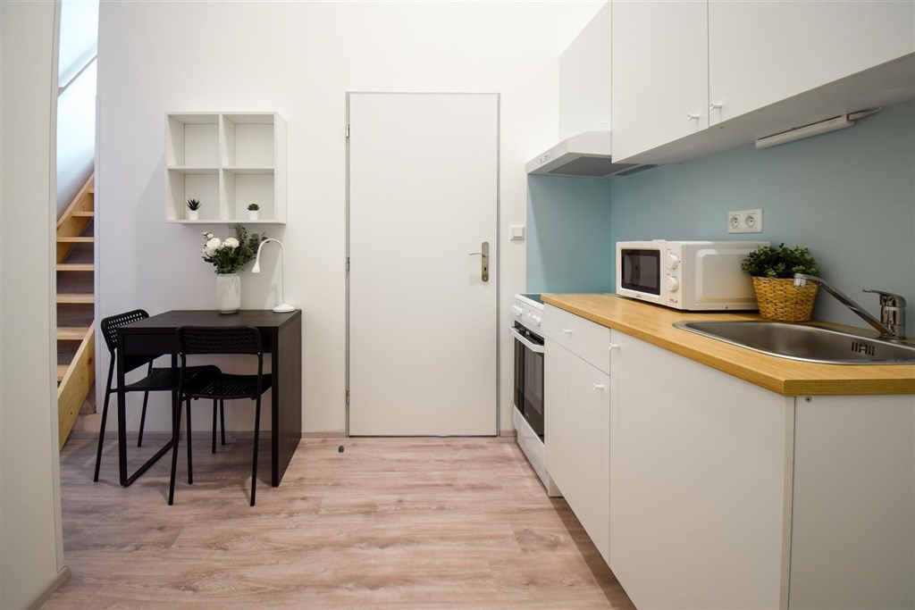 Jedná se o podnájem kompletně vybavené bytové jednotky o velikosti 2+1. Při vstupu do bytové jednotky se nachází moderní kuchyně včetně lednice, sporáku s troubou, mikrovlnné trouby, rychlovarné konvice, digestoře a dřezu. Zároveň v kuchyni naleznete jídelní stůl se židlemi. Jednotce imponuje důmyslné řešení dvou neprůchozích pokojů, které jsou umístěny nad sebou a zajistí tak plné využití prostoru. V každém pokoji naleznete dvě prostorné postele s pohodlnou matrací. U postele dále naleznete noční stolek s lampičkou. V jednotce se dále nachází pracovní stoly se židlemi a prostorná skříň. Koupelna nabízí sprchový kout, záchod a umyvadlo se zrcadlem. K dispozici je příprava pro připojení vlastní pračky.