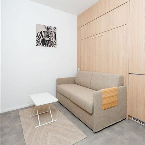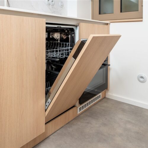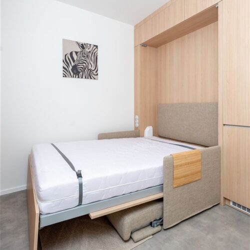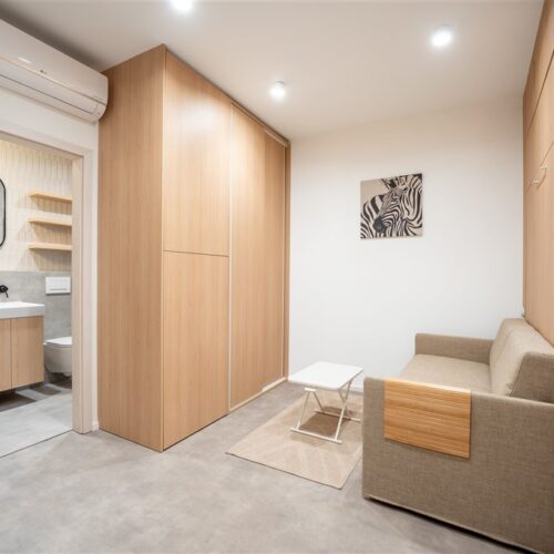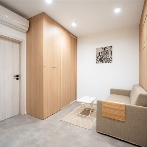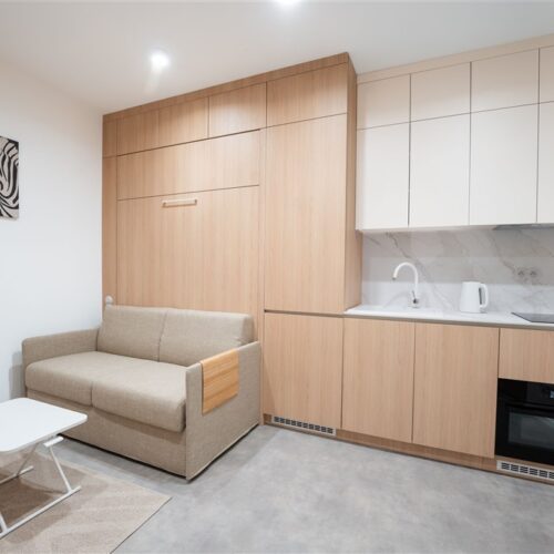 Apartmán je plně vybaven tak, aby ubytovaným poskytl maximální komfort během jejich pobytu. Kuchyňský kout je kompletně zařízen moderními spotřebiči, včetně varné desky, digestoře, kombinované elektrické a mikrovlnné trouby, rychlovarné konvice a lednice s mrazákem. Dominantou obývací části je designový rozkládací gauč, který lze snadno přeměnit v pohodlné dvoulůžko. K dispozici je také moderní televize s možností sledování všech oblíbených programů a vestavěné skříně z kvalitních materiálů, které zajišťují dostatek úložného prostoru. Elegantní koupelna je vybavena sprchovým koutem, toaletou a praktickým úložným prostorem. Součástí apartmánu je také pračka, nenápadně integrovaná do interiéru, klimatizace zajišťující příjemné klima v každém ročním období a vysokorychlostní internetové připojení.