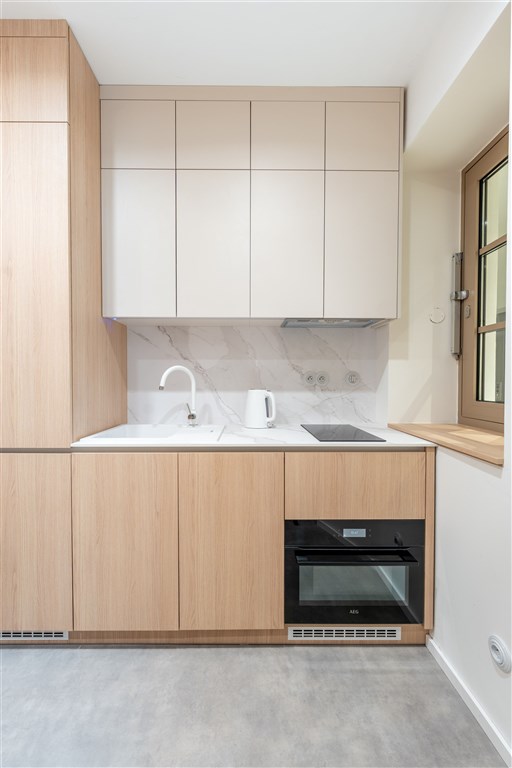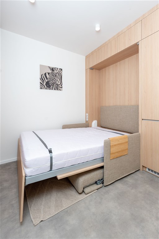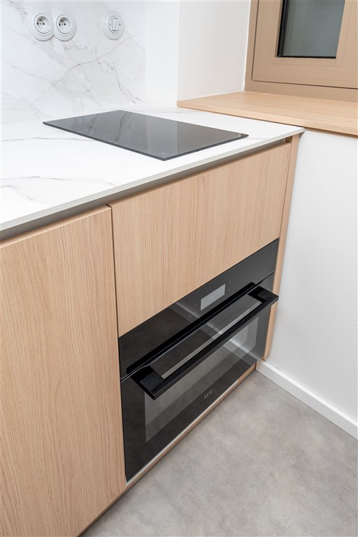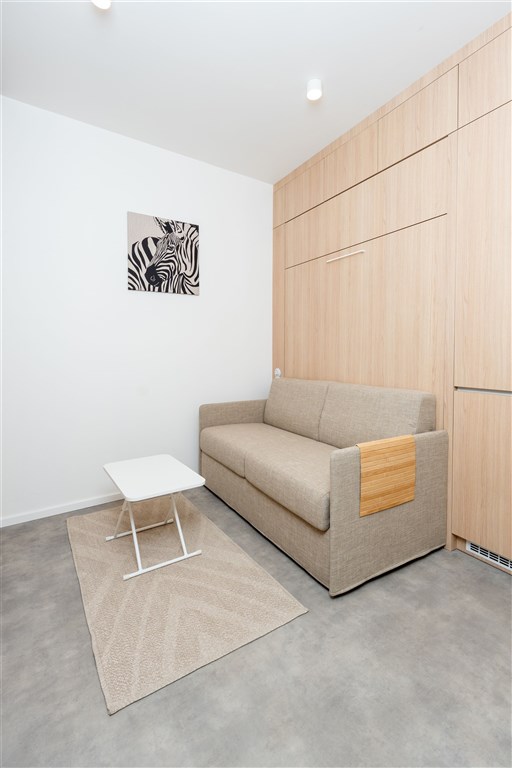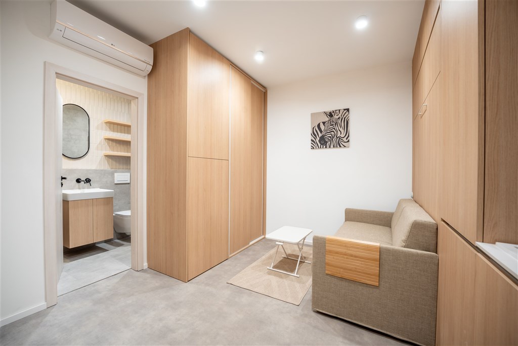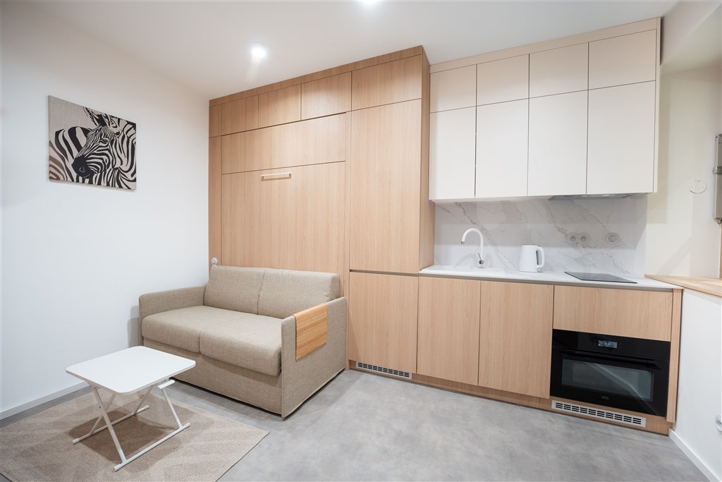 Apartmán je plně vybaven tak, aby ubytovaným poskytl maximální komfort během jejich pobytu. Kuchyňský kout je kompletně zařízen moderními spotřebiči, včetně varné desky, digestoře, kombinované elektrické a mikrovlnné trouby, rychlovarné konvice a lednice s mrazákem. Dominantou obývací části je designový rozkládací gauč, který lze snadno přeměnit v pohodlné dvoulůžko. K dispozici je také moderní televize s možností sledování všech oblíbených programů a vestavěné skříně z kvalitních materiálů, které zajišťují dostatek úložného prostoru. Elegantní koupelna je vybavena sprchovým koutem, toaletou a praktickým úložným prostorem. Součástí apartmánu je také pračka, nenápadně integrovaná do interiéru, klimatizace zajišťující příjemné klima v každém ročním období a vysokorychlostní internetové připojení.
