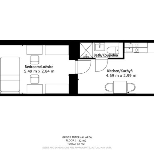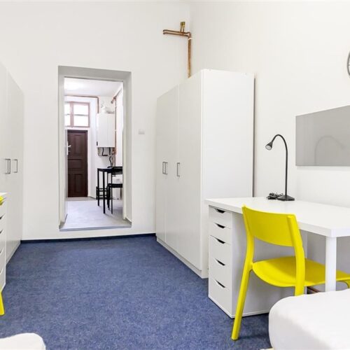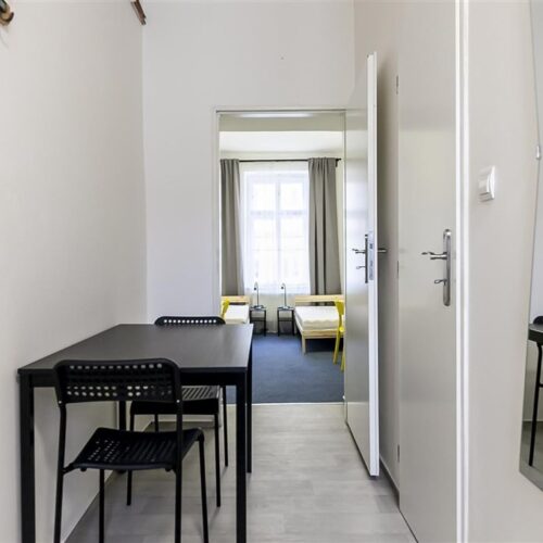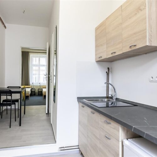 Jedná se o podnájem kompletně vybavené jednotky o dispozici 1+1 v nově zrekonstruovaném domě. Součástí vybavení kuchyně je plně zařízený kuchyňský kout, včetně lednice, dvou plotýnkové sklokeramické desky, digestoře, dřezu, mikrovlnné trouby a varné konvice. Jednotka je vybavena dvěma pracovními stoly s židlemi, dvěma pohodlnými postelemi a dostatečným prostorem na ukládání oblečení. Koupelna je také plně vybavená, a to sprchovým koutem, záchodem a umyvadlem se zrcadlem. K dispozici je příprava pro připojení vlastní pračky.