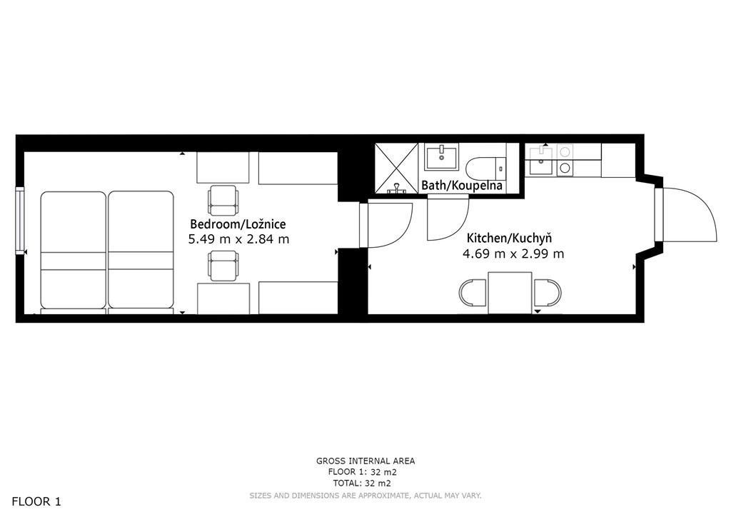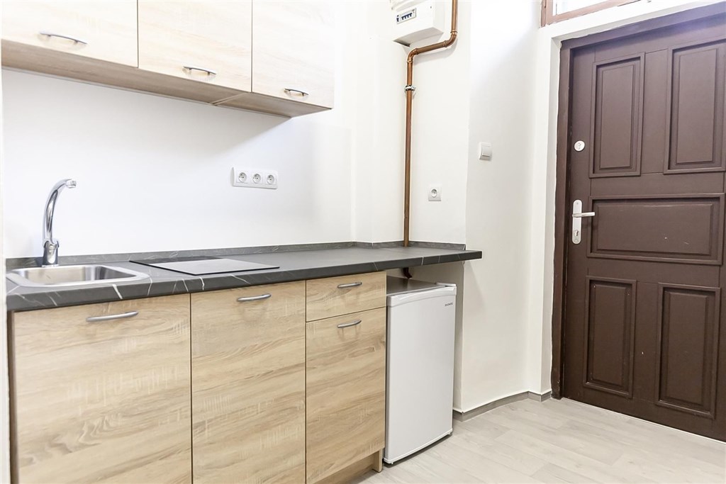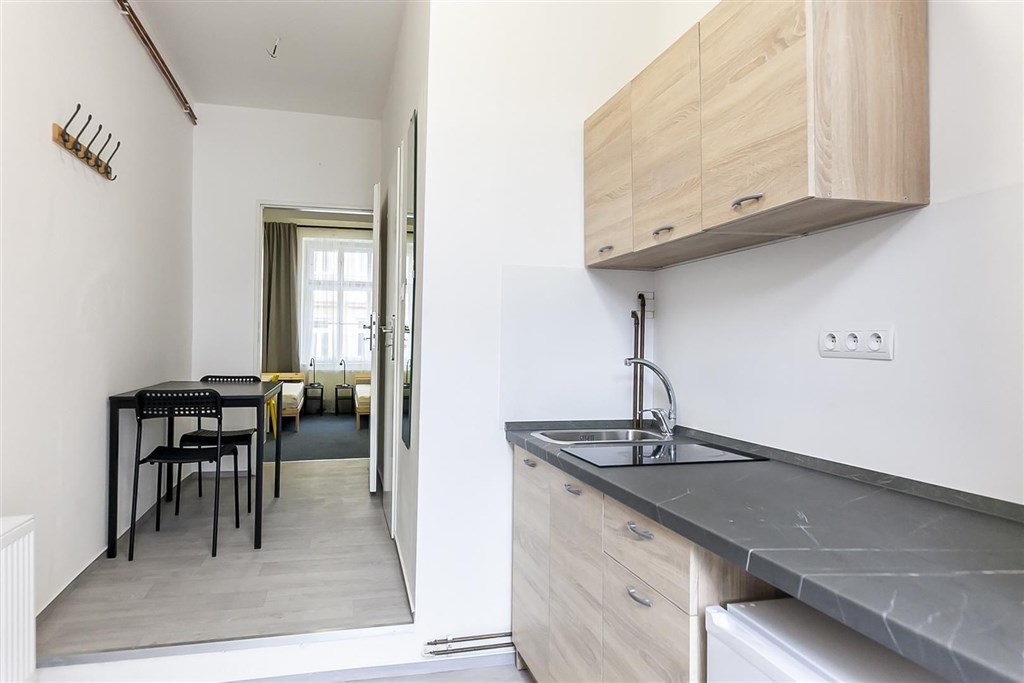 Jedná se o podnájem kompletně vybavené jednotky o dispozici 1+1 v nově zrekonstruovaném domě. Součástí vybavení kuchyně je plně zařízený kuchyňský kout, včetně lednice, dvou plotýnkové sklokeramické desky, digestoře, dřezu, mikrovlnné trouby a varné konvice. Jednotka je vybavena dvěma pracovními stoly s židlemi, dvěma pohodlnými postelemi a dostatečným prostorem na ukládání oblečení. Koupelna je také plně vybavená, a to sprchovým koutem, záchodem a umyvadlem se zrcadlem. K dispozici je příprava pro připojení vlastní pračky.