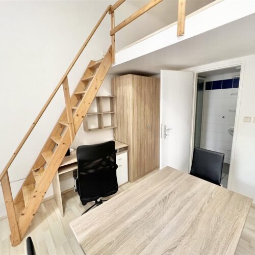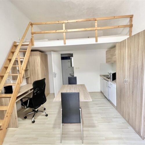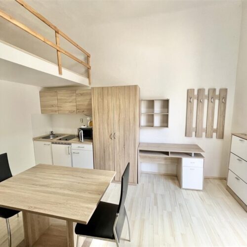 Jedná se o podnájem kompletně vybavené jednotky o dispozici 1+kk ve zrekonstruovaném domě. Součástí je plně zařízený kuchyňský kout včetně lednice, mikrovlnné trouby, varné konvice, sklokeramické desky, digestoře a dřezu. Jednotka je vybavena jídelním a pracovním stolem se židlemi, mezonetovým spaním s nočními stolky a prostornou skříní. Koupelna nabízí sprchový kout, záchod a umyvadlo se zrcadlem. K dispozici je příprava pro připojení vlastní pračky.