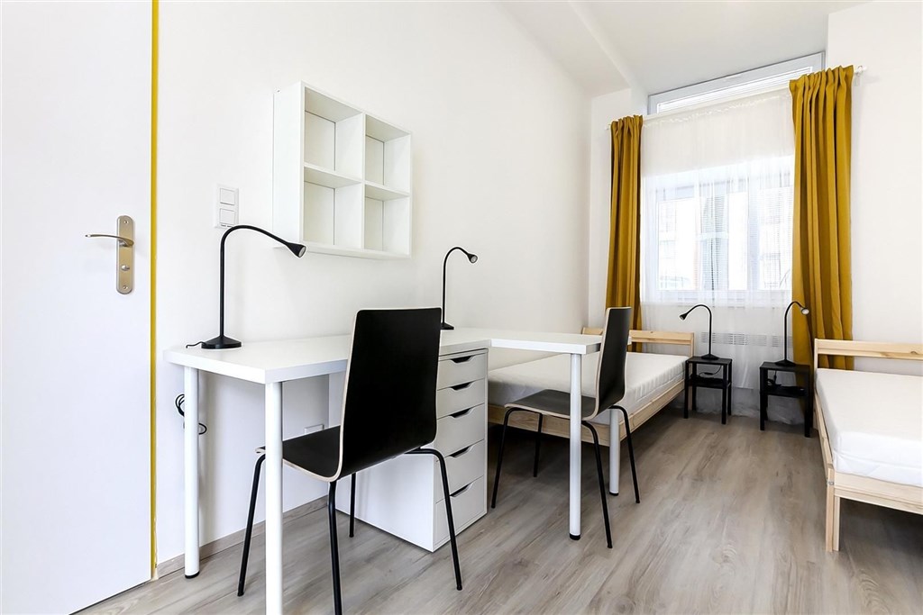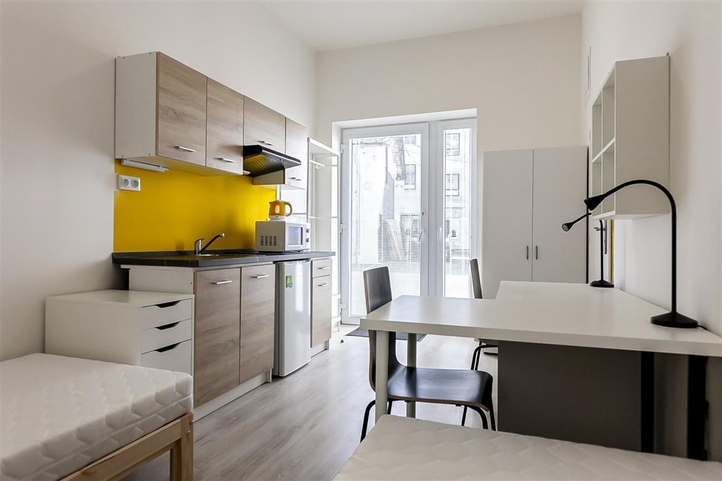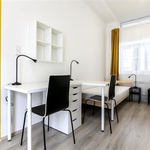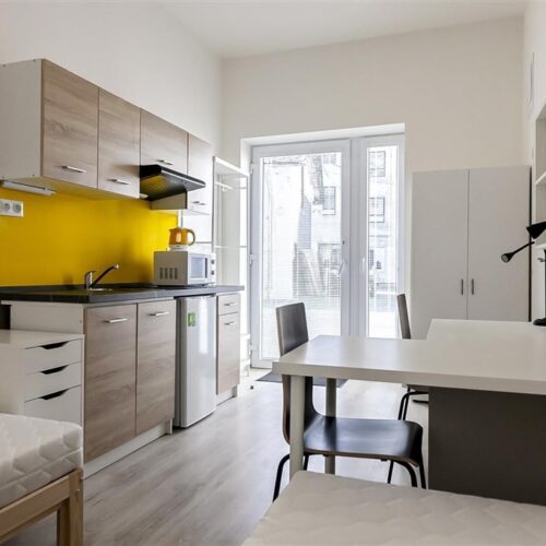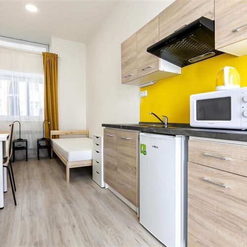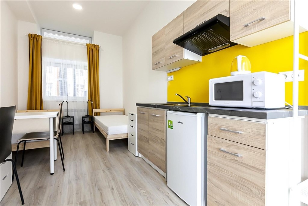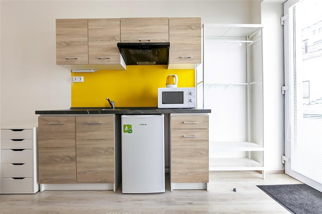 Jedná se o pronájem kompletně vybavené jednotky o dispozici 1+kk v nově zrekonstruovaném domě. Součástí vybavení kuchyně je plně zařízený kuchyňský kout, včetně lednice, dvou plotýnkové sklokeramické desky, digestoře, dřezu, mikrovlnné trouby a varné konvice. Jednotka je vybavena dvěma pracovními stoly s židlemi, dvěma pohodlnými postelemi a dostatečným prostorem na ukládání oblečení. Koupelna je také plně vybavená, a to sprchovým koutem, záchodem a umyvadlem se zrcadlem. K dispozici je příprava pro připojení vlastní pračky.