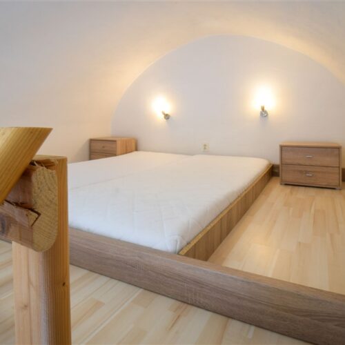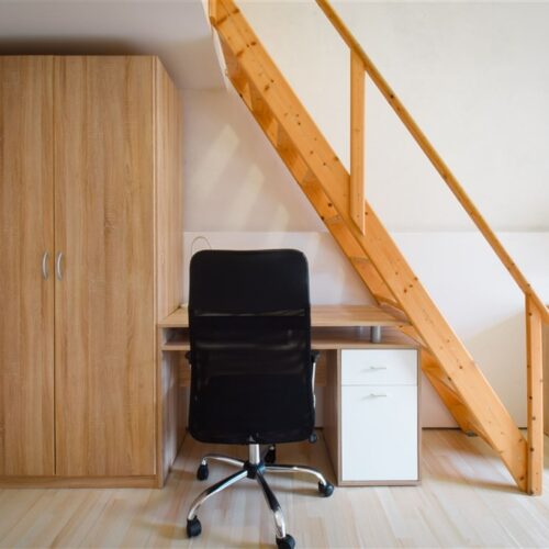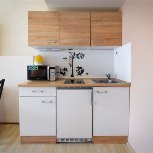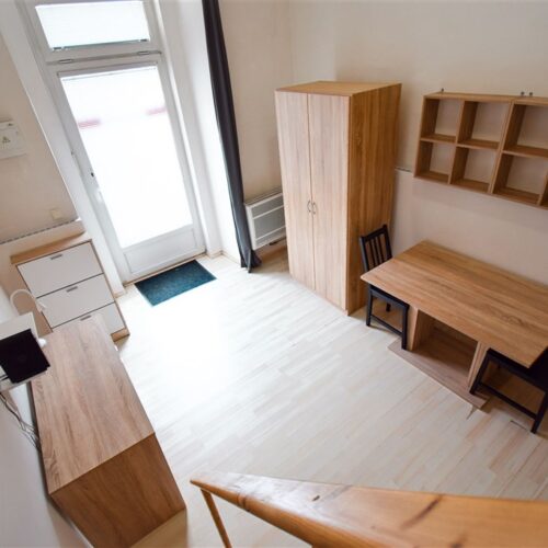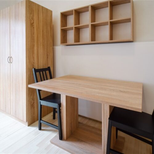 Jedná se o podnájem kompletně vybavené jednotky o dispozici 1+kk v nově zrekonstruovaném domě. Součástí je plně zařízený kuchyňský kout včetně lednice, sklokeramické desky, mikrovlnné trouby, varné konvice, digestoře a dřezu. Jednotka je vybavena dvěma pracovními stoly se židlemi, jídelním stolem se židlemi, mezonetovým spaním a prostornou skříní. Koupelna nabízí sprchový kout, záchod a umyvadlo se zrcadlem. V jednotce je k dispozici internetové připojení a je možné sjednat parkovací kartu se slevou.