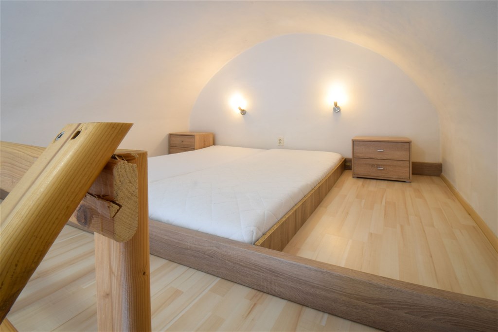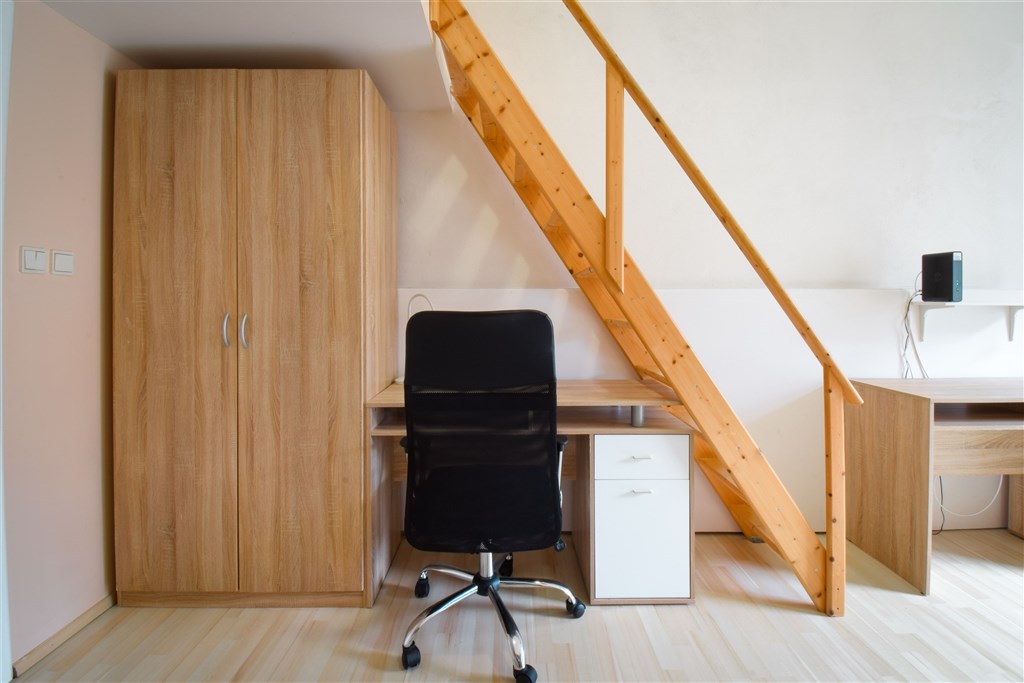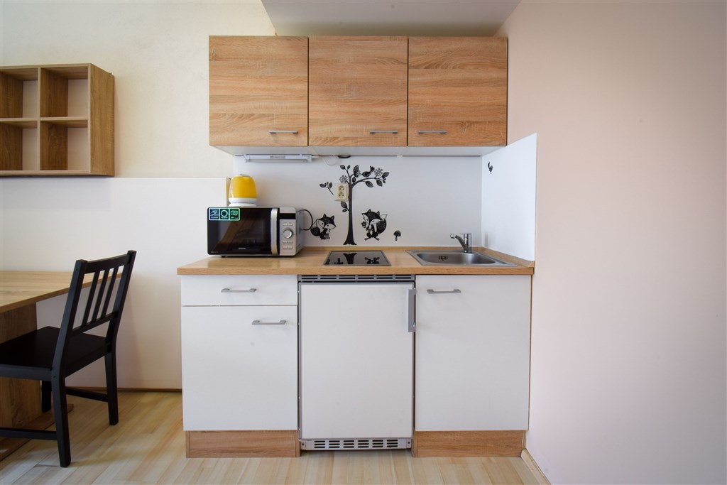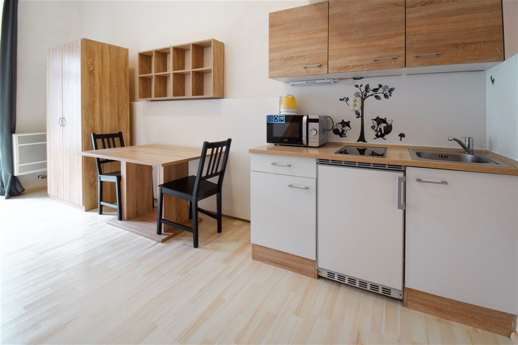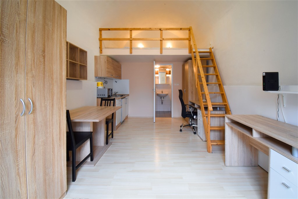 Jedná se o podnájem kompletně vybavené jednotky o dispozici 1+kk v nově zrekonstruovaném domě. Součástí je plně zařízený kuchyňský kout včetně lednice, sklokeramické desky, mikrovlnné trouby, varné konvice, digestoře a dřezu. Jednotka je vybavena dvěma pracovními stoly se židlemi, jídelním stolem se židlemi, mezonetovým spaním a prostornou skříní. Koupelna nabízí sprchový kout, záchod a umyvadlo se zrcadlem. V jednotce je k dispozici internetové připojení a je možné sjednat parkovací kartu se slevou.