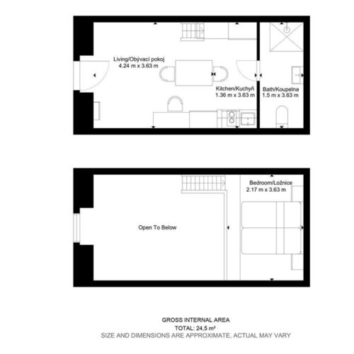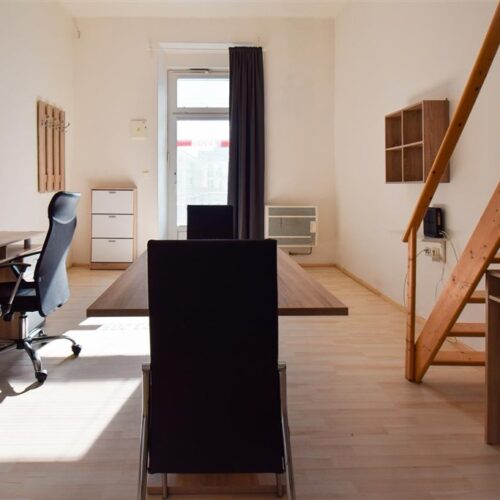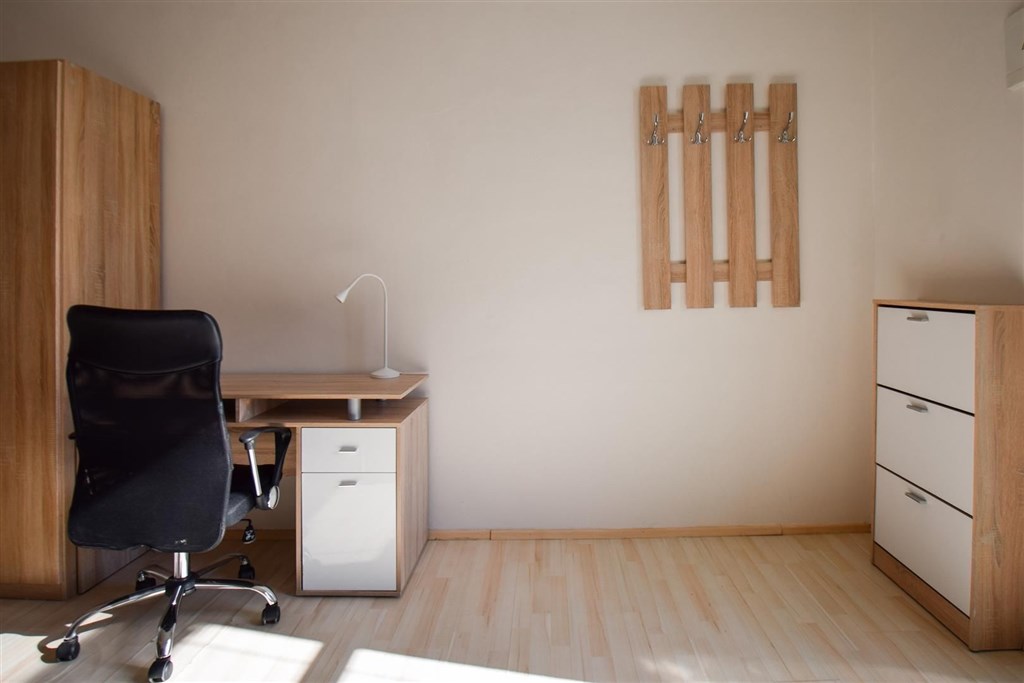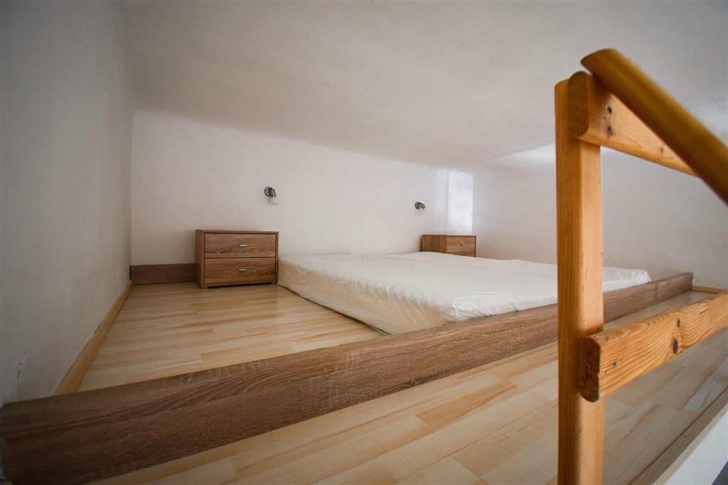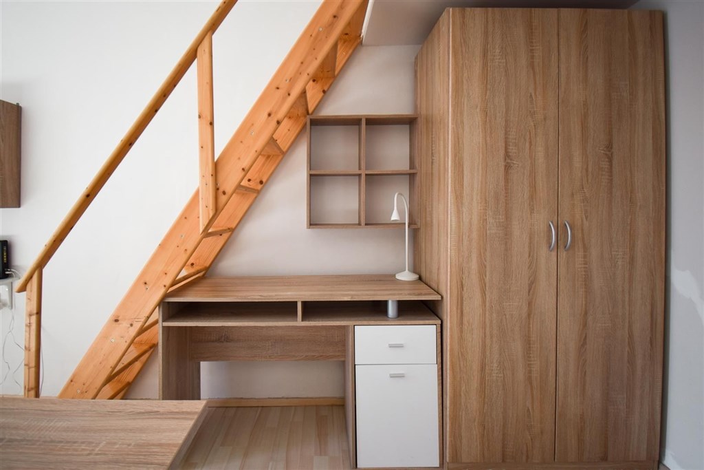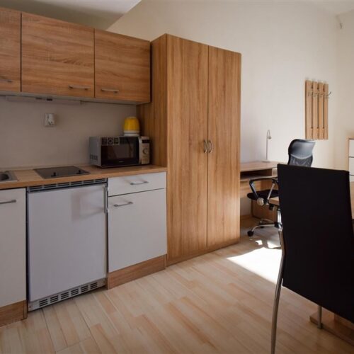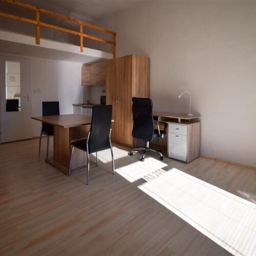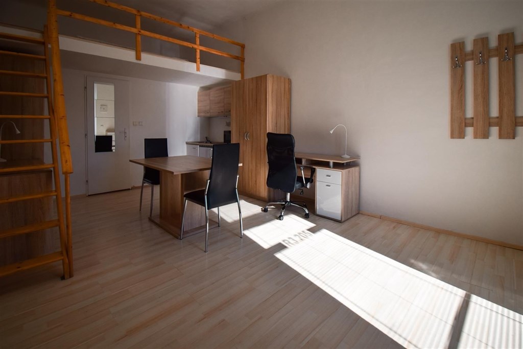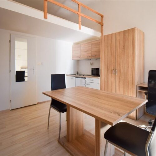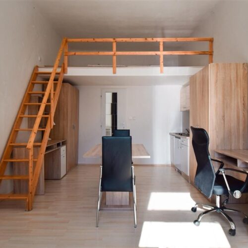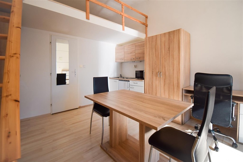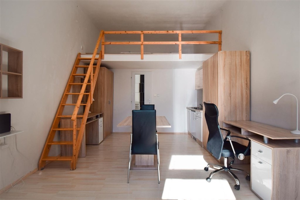 Jedná se o podnájem kompletně vybavené jednotky o dispozici 1+kk ve zrekonstruovaném domě. Součástí vybavení kuchyně je plně zařízený kuchyňský kout včetně lednice, mikrovlnné trouby, varné konvice, sklokeramické desky, digestoře a dřezu. Jednotka je vybavena dvěma pracovními stoly s židlemi, mezonetovým spaním s nočními stolky a prostornou skříní. Koupelna je také plně vybavená, a to sprchovým koutem, záchodem a umyvadlem se zrcadlem. K dispozici je příprava pro připojení vlastní pračky.