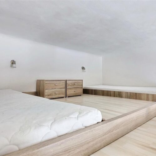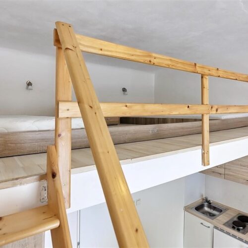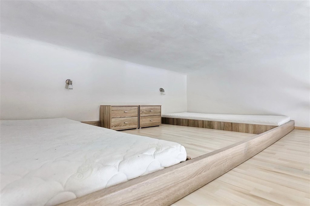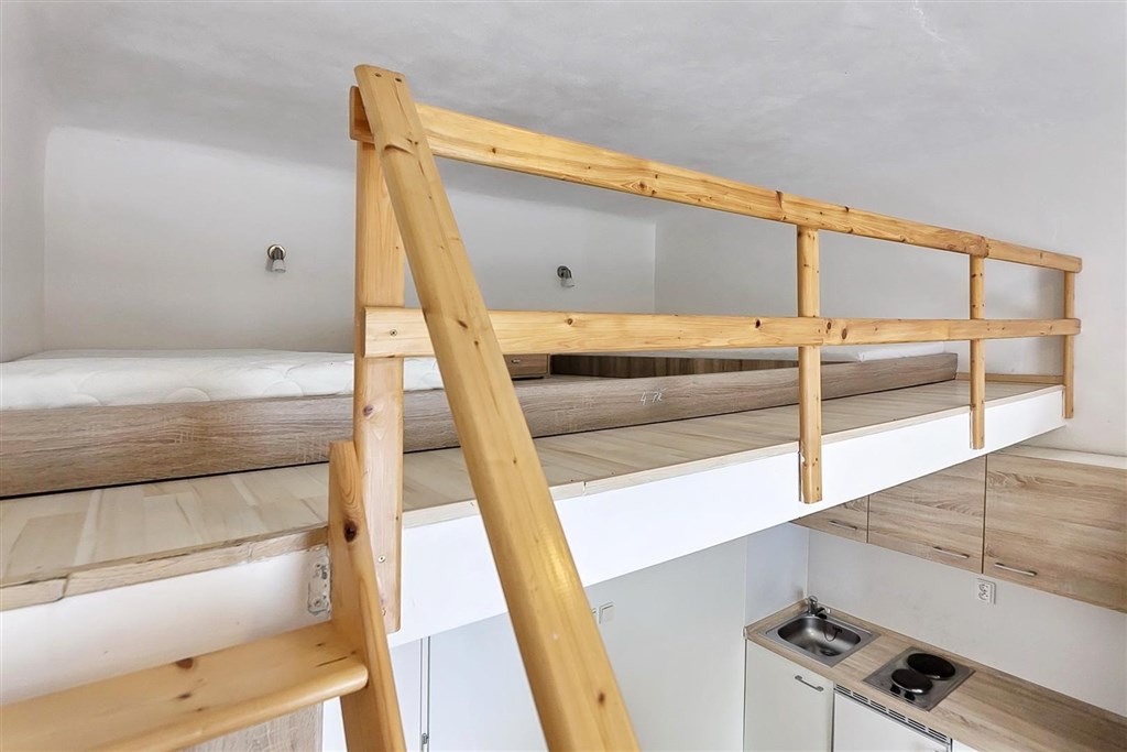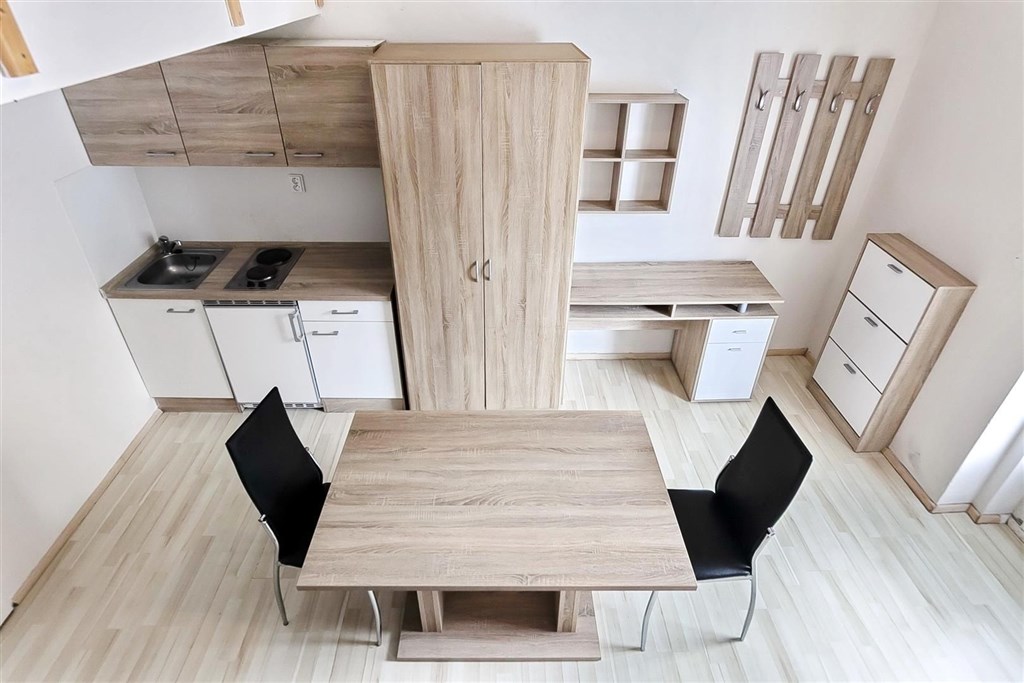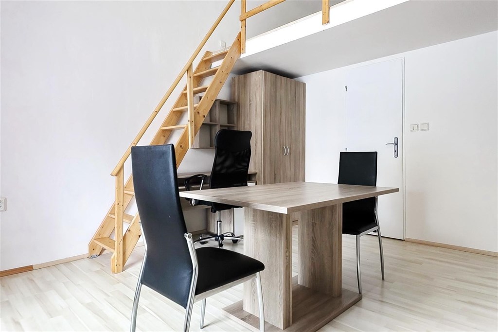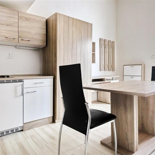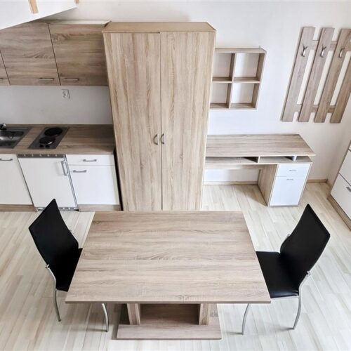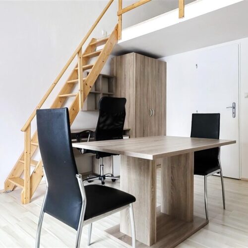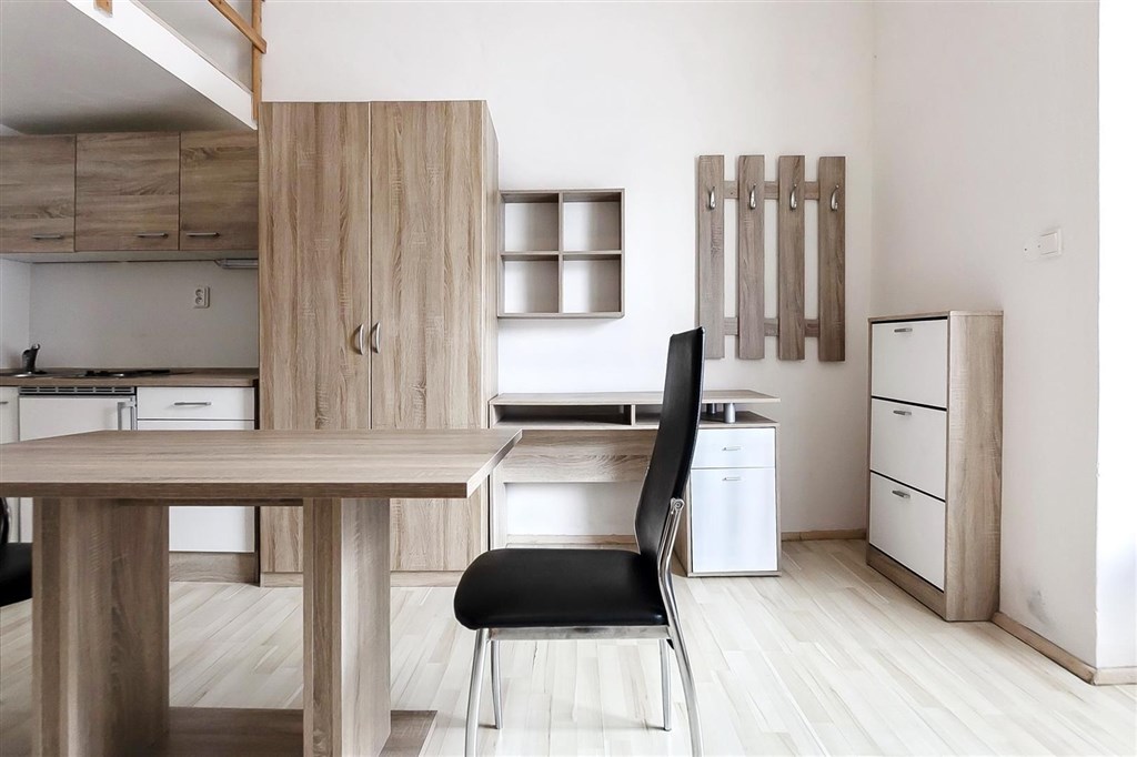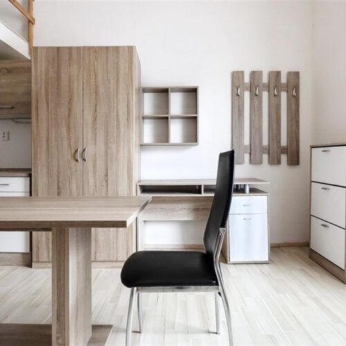 Jedná se o podnájem kompletně vybavené jednotky o dispozici 1+kk ve zrekonstruovaném domě. Součástí vybavení je plně zařízený kuchyňský kout včetně lednice, mikrovlnné trouby, varné konvice, sklokeramické desky, digestoře a dřezu. Jednotka je vybavena dvěma pracovními stoly se židlemi, mezonetovým spaním s nočními stolky a prostornou skříní. Koupelna nabízí sprchový kout, záchod a umyvadlo se zrcadlem. K dispozici je příprava pro připojení vlastní pračky.