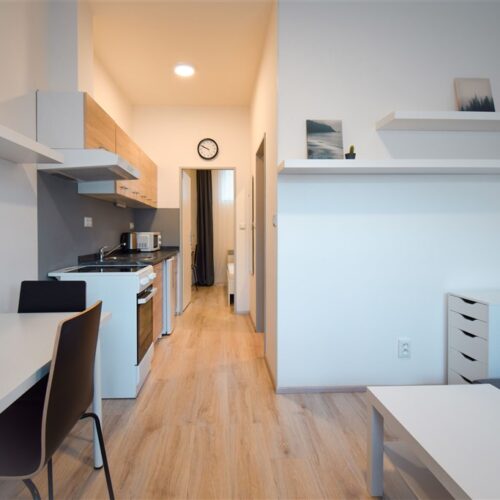 Jedná se o podnájem kompletně vybavené jednotky o dispozici 2+kk v nově zrekonstruovaném domě. K dispozici je kuchyně včetně lednice, sporáku s troubou, mikrovlnné trouby, rychlovarné konvice, digestoře a dřezu. Jednotka je v rámci první části vybavena pohodlným gaučem s konferenčním stolkem, jídelním stolem se židlemi a prostornou věšákovou stěnou. V ložnici se nachází dvě postele s nočními stolky, pracovní stůl a prostorná skříň. Koupelna nabízí sprchový kout, záchod a umyvadlo se zrcadlem. K dispozici je příprava pro připojení vlastní pračky.