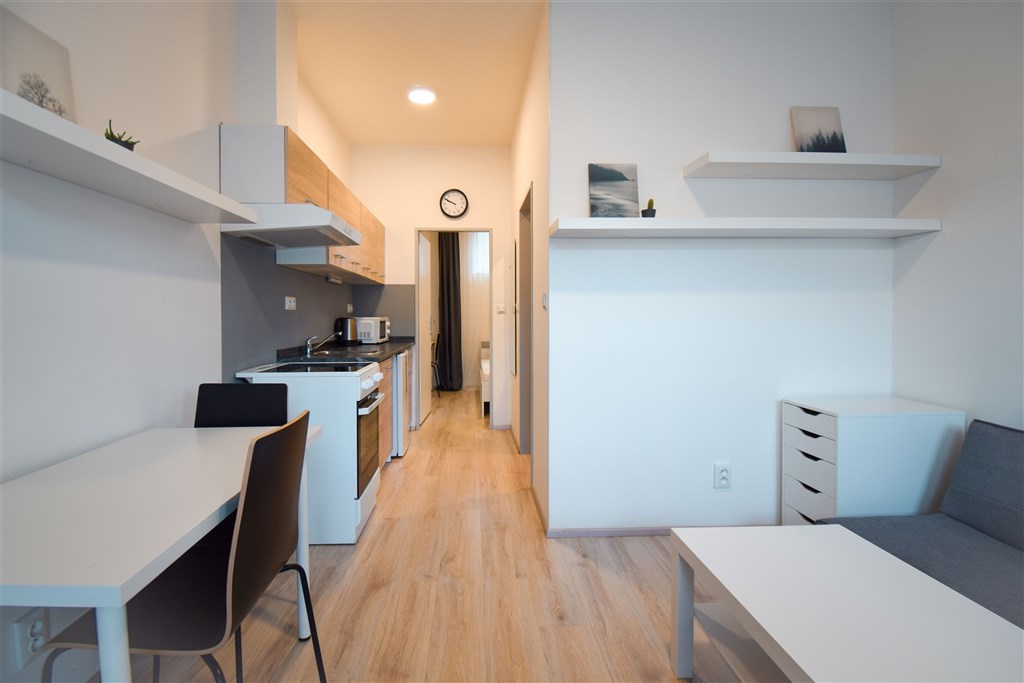 Jedná se o podnájem kompletně vybavené jednotky o dispozici 2+kk v nově zrekonstruovaném domě. K dispozici je kuchyně včetně lednice, sporáku s troubou, mikrovlnné trouby, rychlovarné konvice, digestoře a dřezu. Jednotka je v rámci první části vybavena pohodlným gaučem s konferenčním stolkem, jídelním stolem se židlemi a prostornou věšákovou stěnou. V ložnici se nachází dvě postele s nočními stolky, pracovní stůl a prostorná skříň. Koupelna nabízí sprchový kout, záchod a umyvadlo se zrcadlem. K dispozici je příprava pro připojení vlastní pračky.