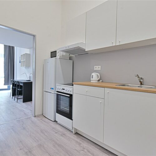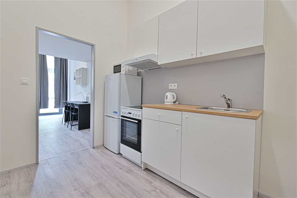 Jedná se o podnájem kompletně vybavené jednotky o dispozici 1+1 v nově zrekonstruovaném domě. Součástí je kuchyně s plně zařízený kuchyňský kout včetně lednice, mikrovlnné trouby, varné konvice, sklokeramické desky, digestoře a dřezu a jídelní stůl se židlemi. Jednotka je vybavena dvěma pracovními stoly, jídelním stolem se židlemi, mezonetovým spaním pro dvě osoby s nočními stolky a prostornou skříní. Koupelna nabízí sprchový kout, záchod a umyvadlo se zrcadlem. K dispozici je příprava pro připojení vlastní pračky.