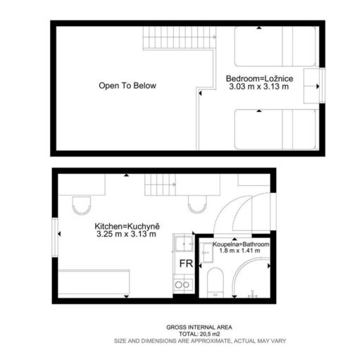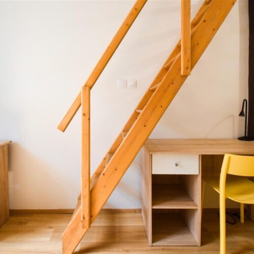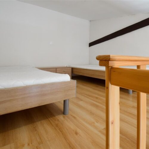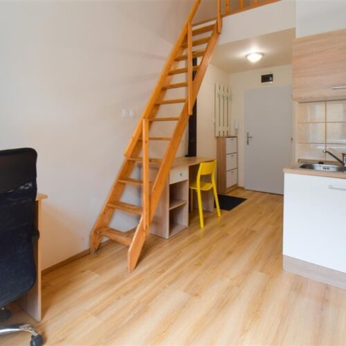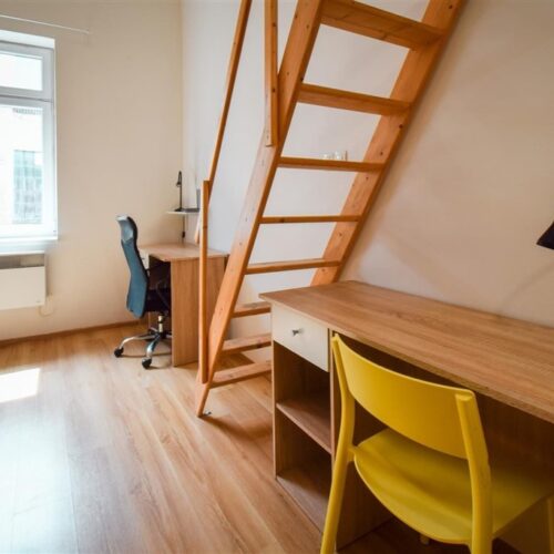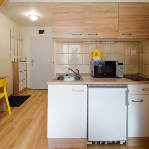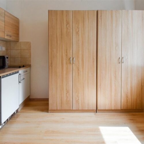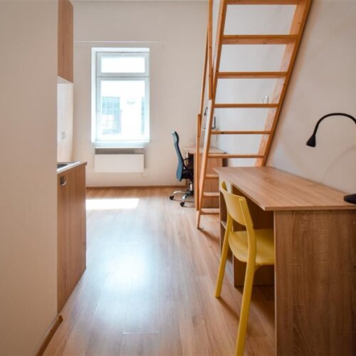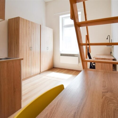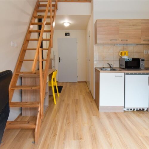 Jedná se o podnájem kompletně vybavené jednotky o dispozici 1+kk v nově zrekonstruovaném domě. Součástí vybavení kuchyně je plně zařízený kuchyňský kout, včetně lednice, varné desky, digestoře a dřezu. Jednotka je vybavena pracovními stoly s židlemi, dvěma postelemi umístěními v mezonetovém prostoru a dostatečným prostorem na ukládání oblečení. Koupelna je také plně vybavená, a to sprchovým koutem, záchodem a umyvadlem se zrcadlem.