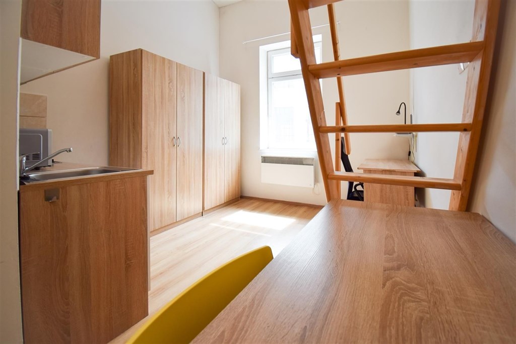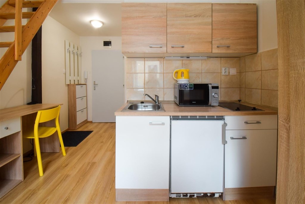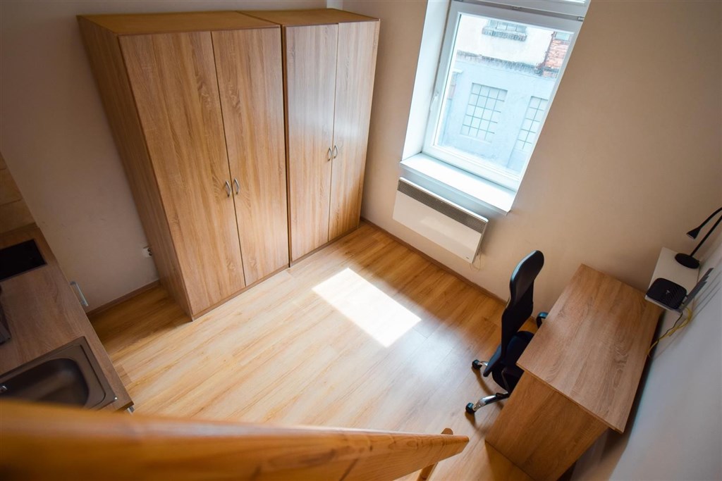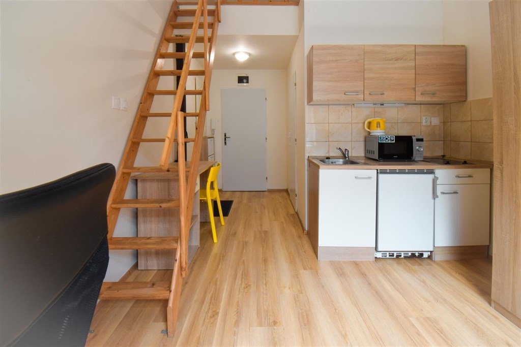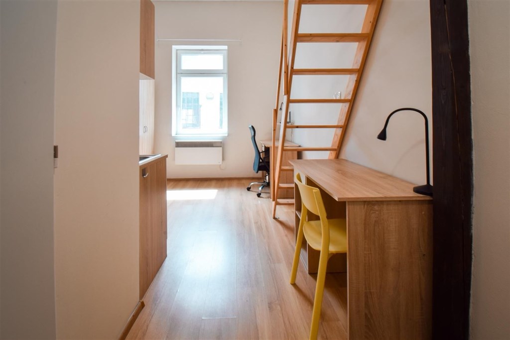 Jedná se o podnájem kompletně vybavené jednotky o dispozici 1+kk v nově zrekonstruovaném domě. Součástí vybavení kuchyně je plně zařízený kuchyňský kout, včetně lednice, varné desky, digestoře a dřezu. Jednotka je vybavena pracovními stoly s židlemi, dvěma postelemi umístěními v mezonetovém prostoru a dostatečným prostorem na ukládání oblečení. Koupelna je také plně vybavená, a to sprchovým koutem, záchodem a umyvadlem se zrcadlem.