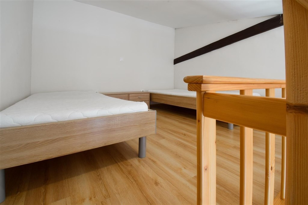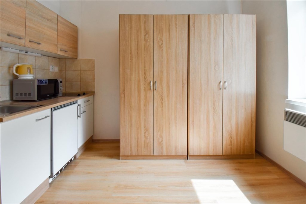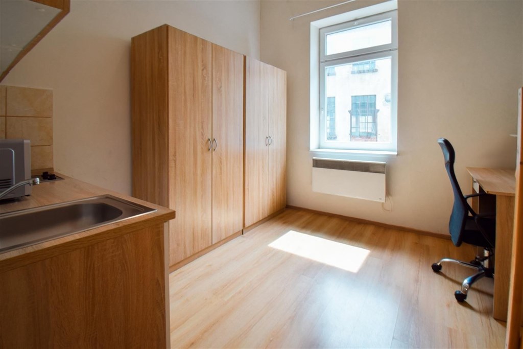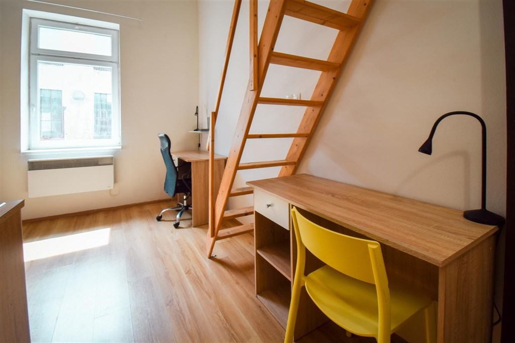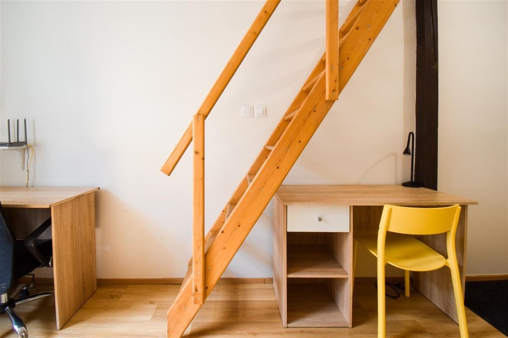 Jedná se o podnájem kompletně vybavené jednotky o dispozici 1+kk v nově zrekonstruovaném domě. Součástí vybavení kuchyně je plně zařízený kuchyňský kout, včetně lednice, varné desky, digestoře a dřezu. Jednotka je vybavena pracovními stoly s židlemi, dvěma postelemi umístěními v mezonetovém prostoru a dostatečným prostorem na ukládání oblečení. Koupelna je také plně vybavená, a to sprchovým koutem, záchodem a umyvadlem se zrcadlem.