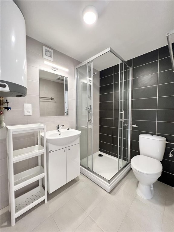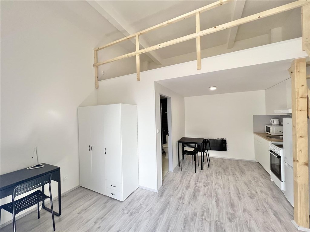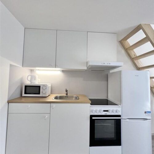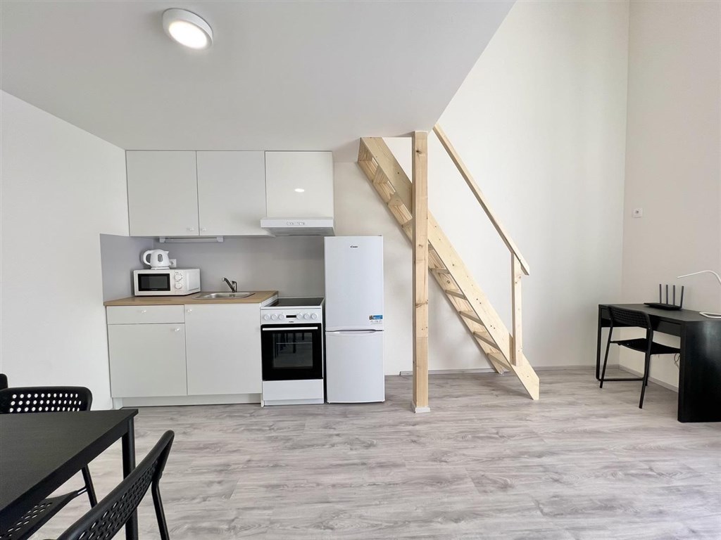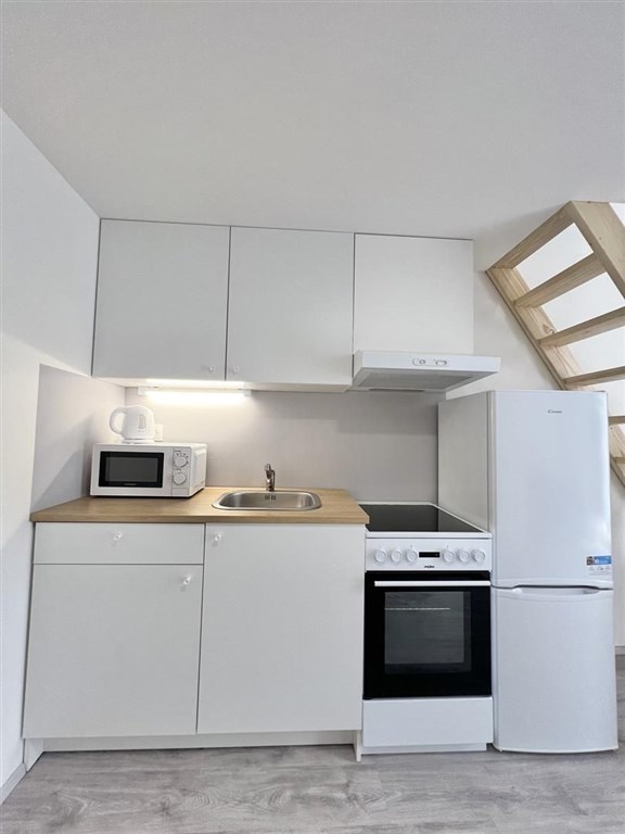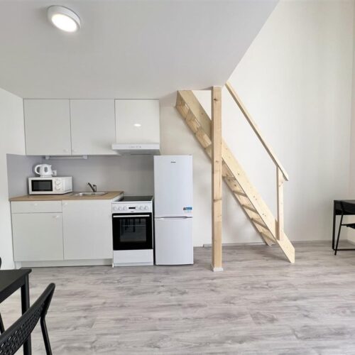Jedná se o podnájem kompletně vybavené jednotky o dispozici 1+kk v nově zrekonstruovaném domě. Součástí je plně zařízený kuchyňský kout včetně lednice, mikrovlnné trouby, varné konvice, sklokeramické desky, digestoře a dřezu. Jednotka je vybavena dvěma pracovními stoly, jídelním stolem se židlemi, mezonetovým spaním pro dvě osoby s nočními stolky a prostornou skříní. Koupelna nabízí sprchový kout, záchod a umyvadlo se zrcadlem. K dispozici je příprava pro připojení vlastní pračky.