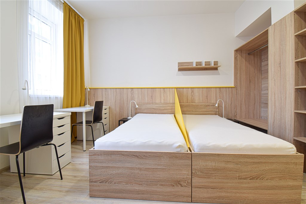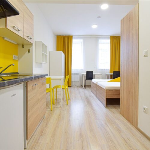 Jedná se o podnájem kompletně vybavené jednotky o dispozici 1+kk v zrekonstruovaném domě. Součástí vybavení kuchyně je plně zařízený kuchyňský kout, včetně lednice, sklokeramické desky, mikrovlnné trouby, varné konvice, digestoře a dřezu. Jednotka je vybavena pracovním stolem se židlemi, dvěma postelemi s nočními stolky a dostatečným prostorem na ukládání oblečení. Koupelna je také plně vybavená, a to sprchovým koutem, záchodem a umyvadlem se zrcadlem. K dispozici je příprava pro připojení vlastní pračky.