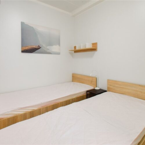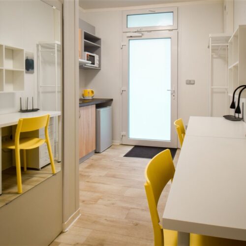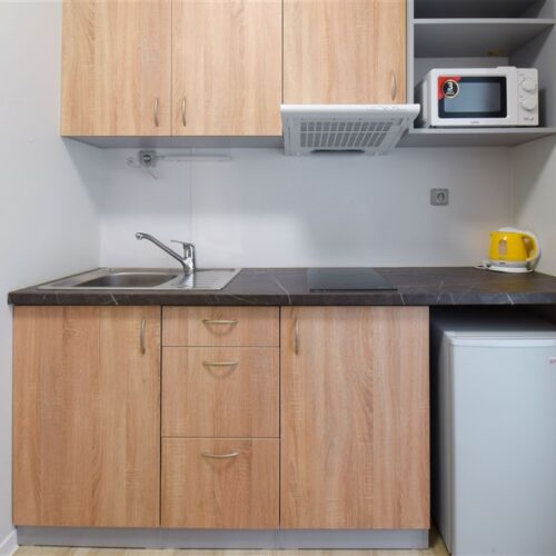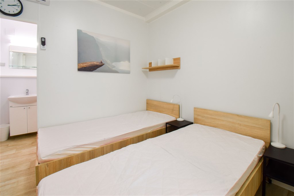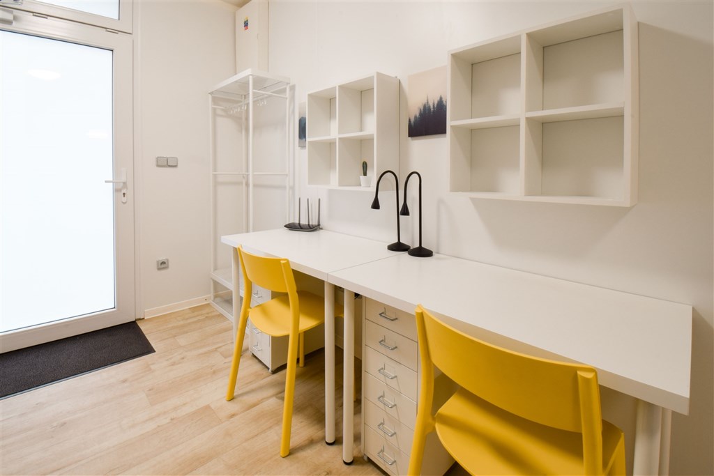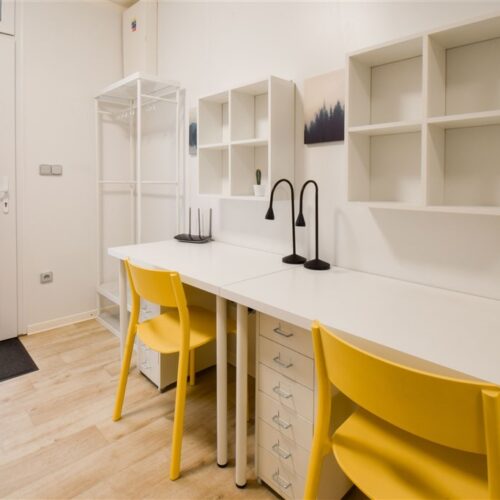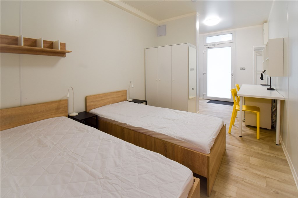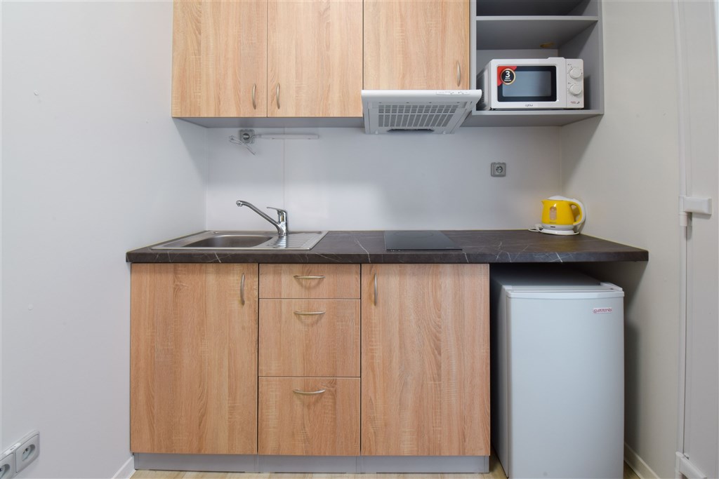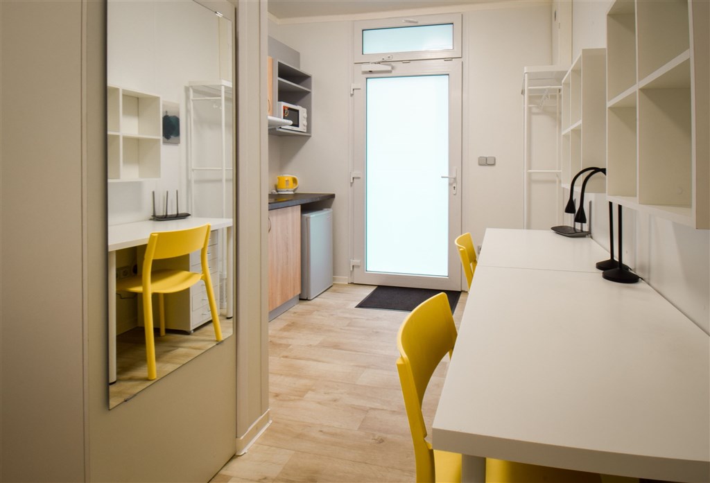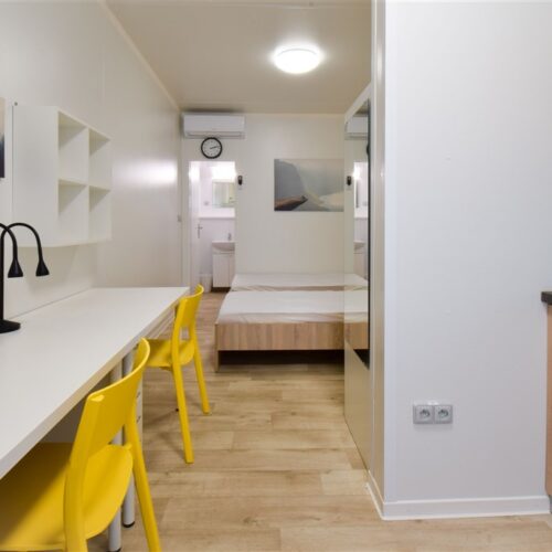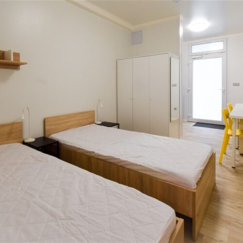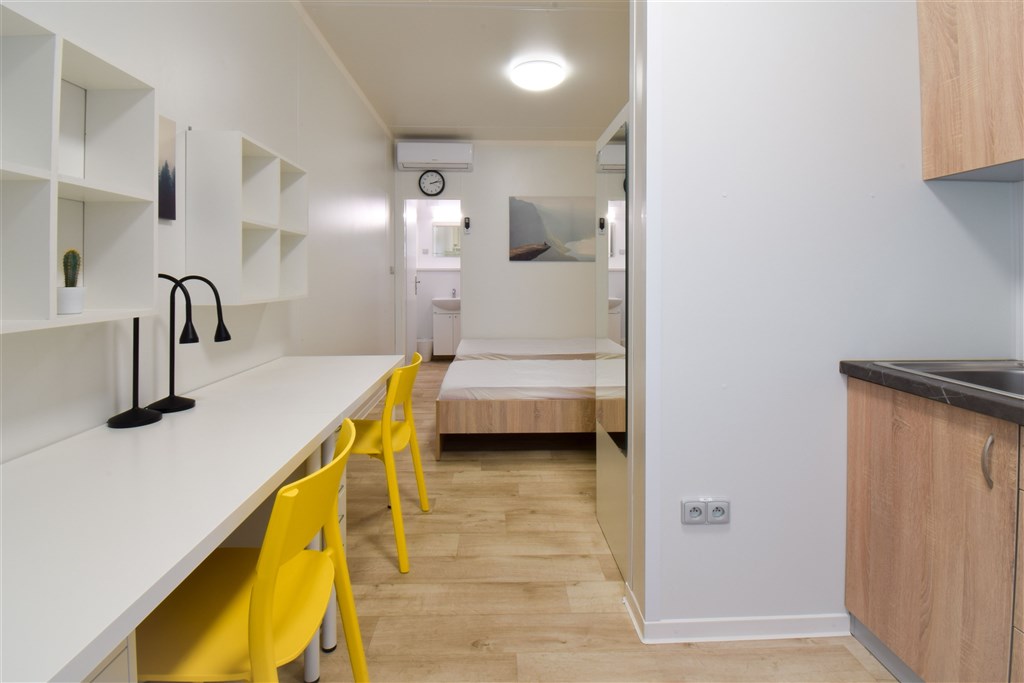 Jedná se o podnájem moderní jednotky o dispozici 1+kk, která je kompletně vybavená. Součástí vybavení kuchyně je plně zařízený kuchyňský kout, včetně lednice, mikrovlnné trouby, varné konvice, sklokeramické desky, digestoře a dřezu. Jednotka je vybavena dvěma pohodlnými postelemi s nočními stolky, dvěma pracovními stoly se židlemi a dostatečným prostorem na ukládání oblečení. Koupelna je také plně vybavená, a to sprchovým koutem, záchodem a umyvadlem. K dispozici je příprava pro připojení vlastní pračky.