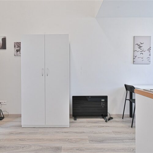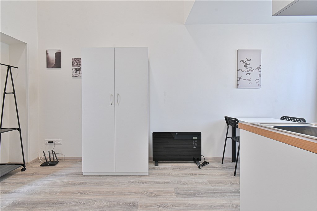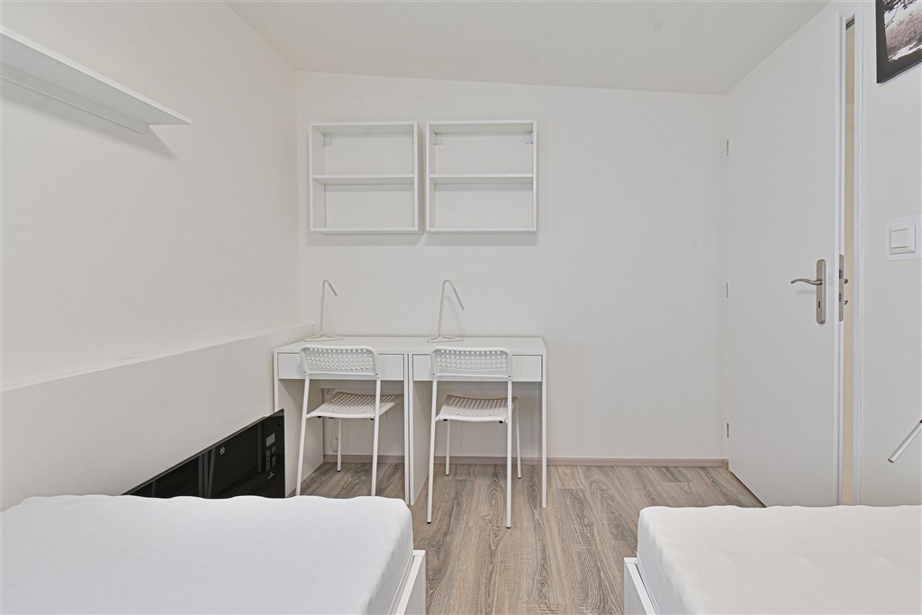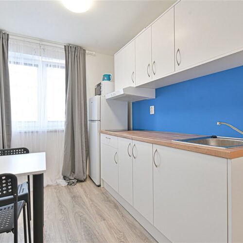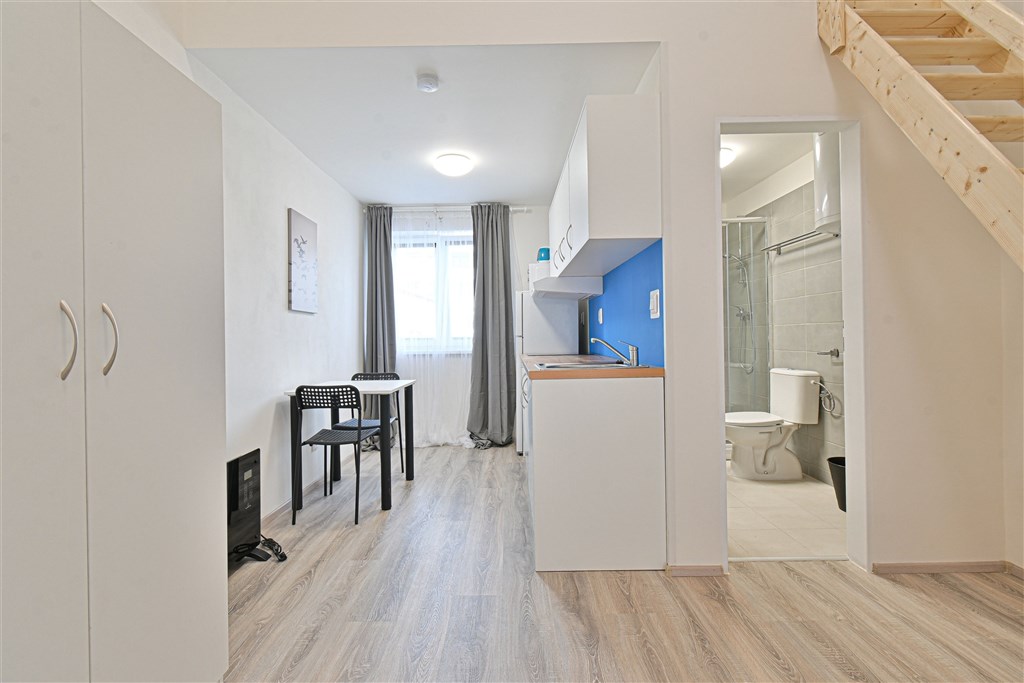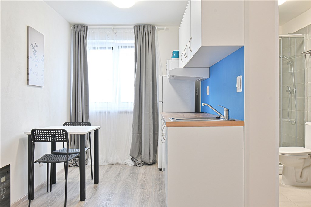 Jedná se o podnájem kompletně vybavené jednotky o velikosti 1+1. K dispozici je moderní kuchyně včetně lednice, sklokeramické desky, mikrovlnné trouby, varné konvice, digestoře a dřezu. Zároveň se v kuchyni nachází jídelní stůl se židlemi. V pokoji naleznete dvě prostorné postele s pohodlnou matrací. U postele dále naleznete noční stolek s lampičkou. Pokoj má pracovní stůl s úložným prostorem, dvě pohodlné židle a prostornou skříň. Koupelna nabízí sprchový kout, záchod a umyvadlo se zrcadlem. Součástí jednotky je internetové připojení.