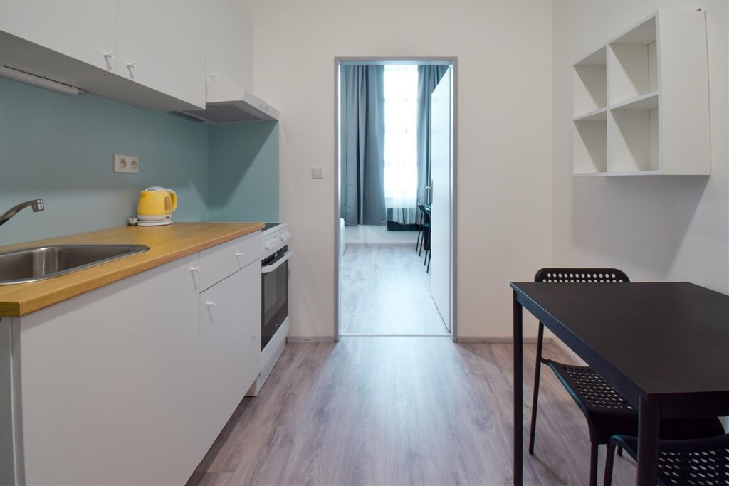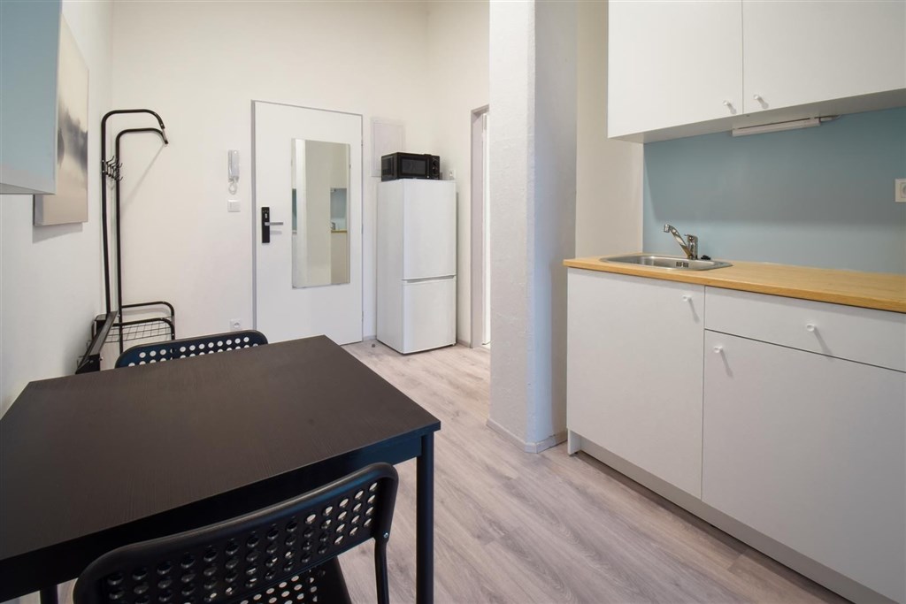 Jedná se o podnájem kompletně vybavené jednotky o dispozici 1+1 v nově zrekonstruovaném domě. Součástí je plně zařízený kuchyňský kout včetně lednice, sporáku s troubou, digestoře, dřezu, mikrovlnné trouby a varné konvice. Jednotka je plně vybavena nábytkem, koupelna nabízí sprchový kout, záchod a umyvadlo se zrcadlem. K dispozici je příprava pro připojení vlastní pračky.