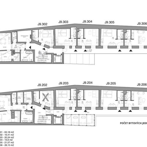 Jednotky se nacházejí ve 2. a 3. nadzemním podlaží domu. Každé patro nabízí prostornou jednotku typu 2+kk s výhledem do ulice a dále jednotky o dispozici 1+kk s různou podlahovou plochou. Každá jednotka je plně vybavena a připravena k okamžitému užívání. Součástí standardu jsou moderní spotřebiče, jako je televizor, trouba s mikrovlnnou funkcí, varná konvice, sklokeramická varná deska, myčka nádobí, lednice, pračka se sušičkou a klimatizace. Jednotky jsou navrženy s důrazem na styl, funkčnost a estetický detail – každý prostor působí útulně, moderně a ladí s jednotným, kvalitním interiérovým konceptem, který odpovídá vysokým nárokům na komfortní bydlení.