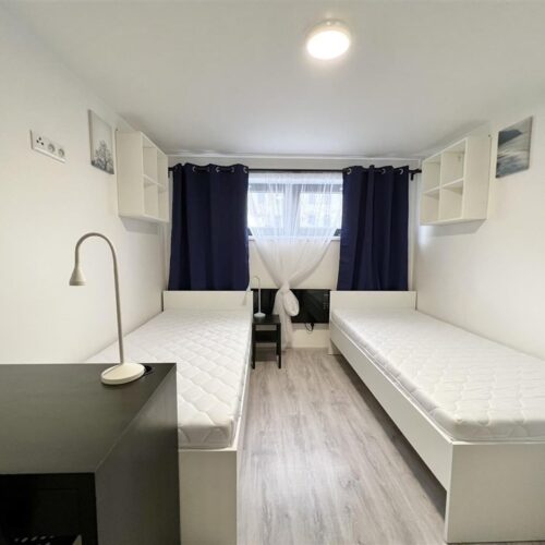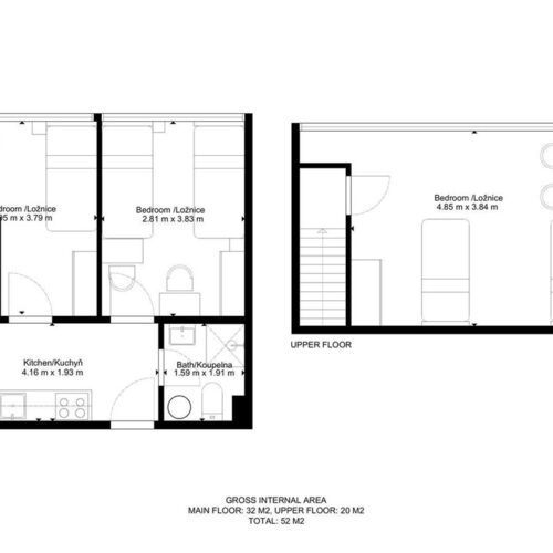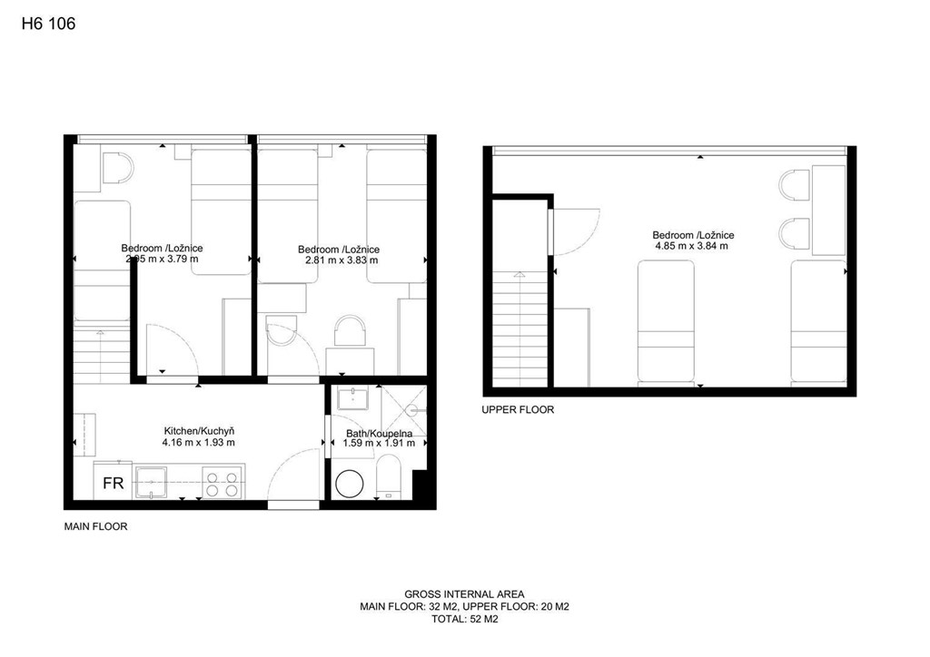 Jedná se o jednotku o dispozici 3+1, která je nabízena plně vybavená a je vhodná až pro 6 osob. Jednotce imponuje důmyslné řešení tří neprůchozích pokojů, kdy jeden z pokojů se nachází na odděleném patře. Moderní kuchyně je plně zařízená včetně lednice, sporáku s troubou, mikrovlnné trouby, rychlovarné konvice, digestoře a dřezu a zároveň v kuchyni naleznete prostorný jídelní stůl se židlemi. Každá ložnice je vybavena dvěma oddělenými pohodlnými postelemi s nočními stolky, které je případně možné dát k sobě a vytvořit tak manželskou postel pro pár. Dále se v ložnici nachází dva pracovní stoly se židlemi a prostorná skříň. Koupelna nabízí sprchový kout, záchod a umyvadlo se zrcadlem. K dispozici je příprava pro připojení vlastní pračky. V jednotce je k dispozici internetové připojení. Ke každé jednotce nabízíme možnost sjednání parkovací karty se slevou.
